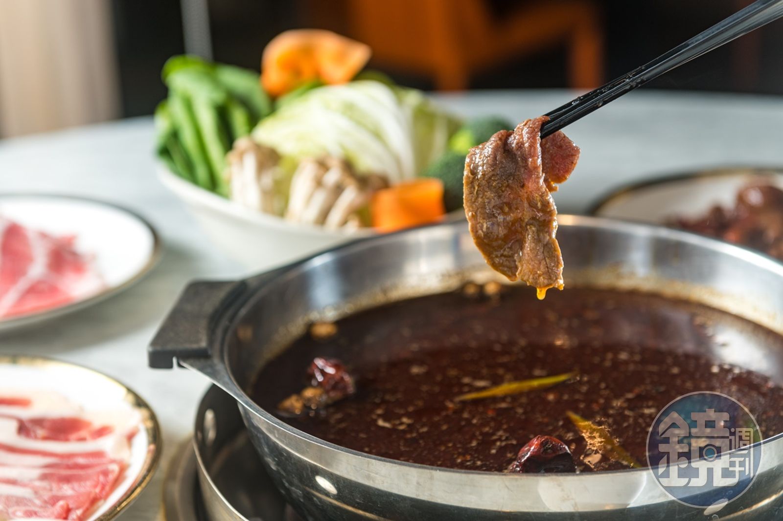 麻辣湯底的氣味更是獨樹一格。主廚除了用中藥材、四川豆瓣醬、二荊條辣椒等食材炒麻辣醬,還融合法式油封鴨腿的概念,把澳洲和牛煸出來的油脂,覆蓋在麻辣醬上,並在室溫約攝氏20度的冷氣房裡,靜置熟成2週。