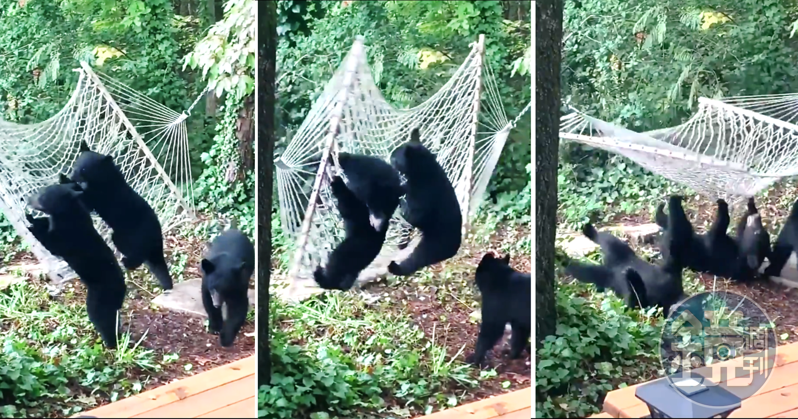 美國一位網友「威廉(William Ainsworth)」,日前在田納西州的山區度假勝地「蓋特林堡(Gatlinburg)」,拍攝到3隻小黑熊跑來玩度假村的吊床。一開始其中一隻悠閒地躺在吊床上,另一隻也想爬上去,過程中卻讓吊床翻倒,害原本躺在吊床上的小熊摔到地上,後來兩隻小熊一起試圖爬上吊床,卻再度弄翻吊床,兩熊神同步的一起往後跌倒。