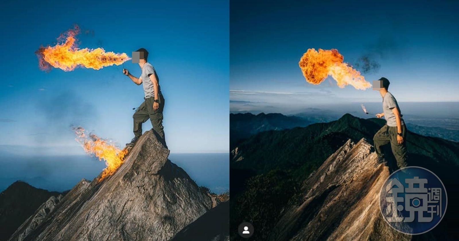 一名網友在臉書社團「靠北登山大小事」表示,在逛IG鳶嘴山照片時看見這張照片,「請問該怎麼處裡。這歪風不可長」,只見圖片中一名男子站在山頭表演「噴火秀」,前腳下方也有一片火勢,並寫下「火龍的咆哮」,地標則是「火燒的寂寞」。