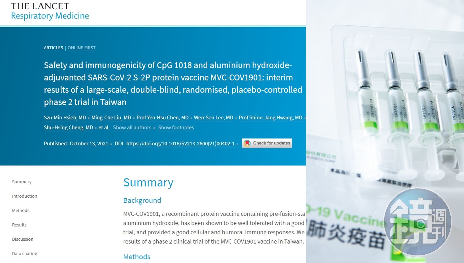 根據《自由時報》報導,高端此份論文名為《運用CpG1018佐劑的高端武漢肺炎蛋白疫苗的安全性和免疫性:台灣大規模雙盲、隨機的二期試驗大規模中期結果報告》,論文第一作者為台大醫師謝思民,第二作者為北醫醫師劉明哲,通訊作者則為高端疫苗二期臨床測試主持人林奏延,並有11家臨床試驗中心與高端研發團隊共同完成論文撰寫。