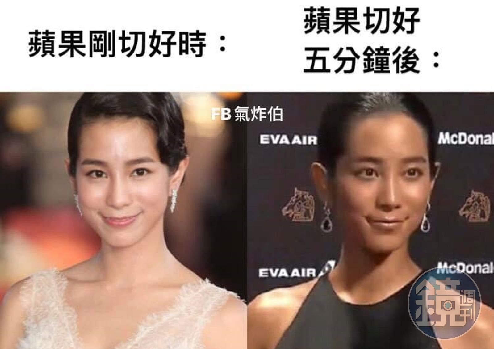 臉書粉專「氣炸伯」貼出一張迷因圖,將温貞菱膚色白皙的照片寫著「蘋果剛切開時」,又將温貞菱黝黑的照片寫著「蘋果切好五分鐘後」。