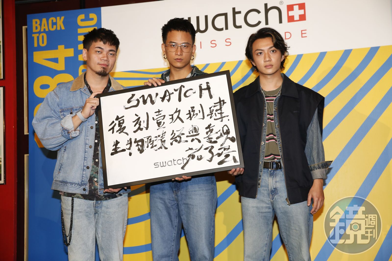 在活動最後,3人現場被考驗文學素養,要用毛筆揮毫寫出「SWATCH復刻壹玖捌肆生物陶瓷材質經典重現」,結果阿德在寫「重」字還凸槌,阿斌急著連忙救火!不過,能將阿拉伯數字「1984」轉寫正楷「壹玖捌肆」,真的厲害膩~鼓鼓掌!(不會是因為常跑銀行吧?)