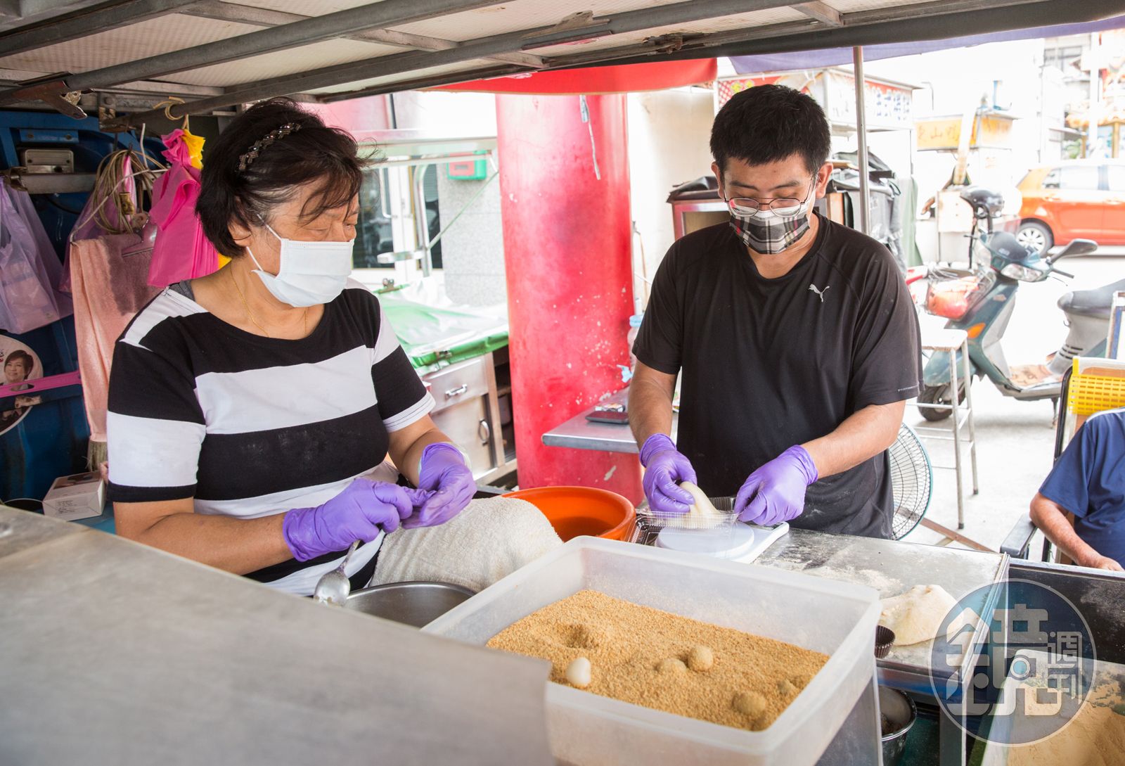 施建旭原本是負責照顧行動不便、躺床長者的護理師,從沒想過接班。2年前父親因病驟逝,為了陪伴媽媽,他返家接手老店。醫療工作者出身,他的清消極為嚴謹,尤其是疫情時代,器具使用完立刻刷洗,再噴酒精消毒,包餡也要戴手套。從細節微調,加上施建旭身段比父親柔軟,總是親切地喚著阿伯、阿姨,嘴甜更幫麻糬加分。