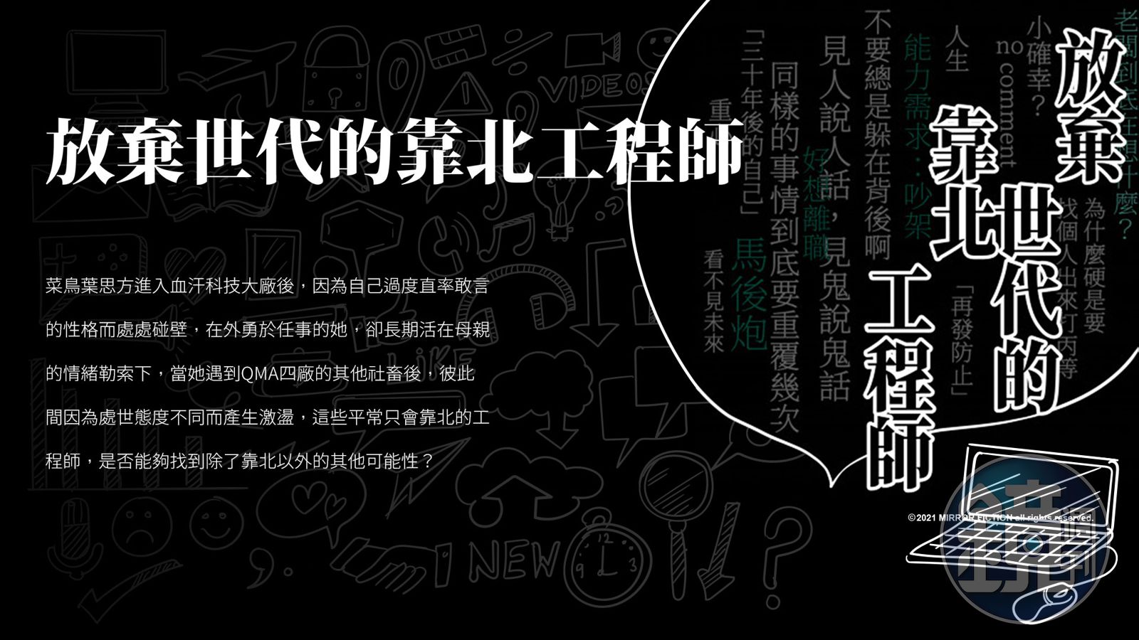 《放棄世代的靠北工程師》共有五章,八萬字的書寫中從第一章〈這次是年輕妹妹啊〉,帶出菜鳥葉思方進入半導體公司QMA發生的大小事,葉思方工作的四廠主要負責消耗其他產區的不足產能,而葉思方的主要工作便是計算四廠廠區的產能並與其他部門溝通。然而,四廠長期缺乏人力,工程師離職率高,雖然有前輩林懷安指導,但因為林懷安長期過勞,忙不過來,葉思方到職後沒能好好受訓便上戰場。