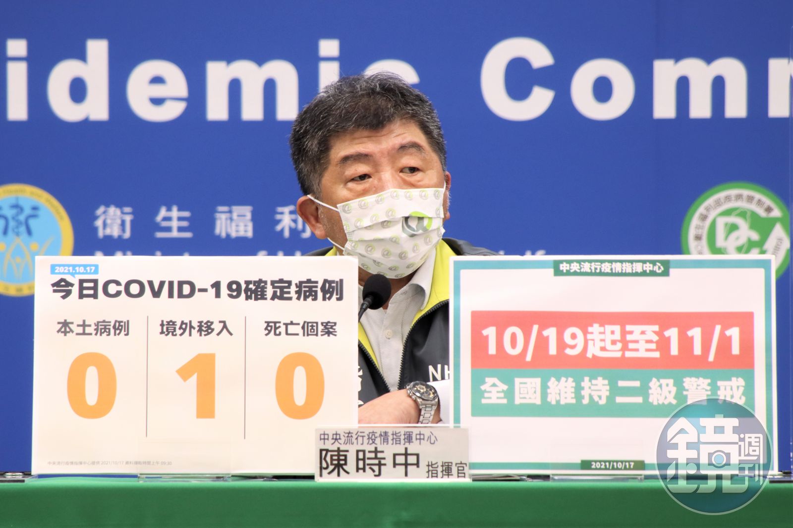 陳時中指出,考量國內疫情目前已趨緩並且穩定控制,經與相關單位溝通討論及評估後,中央流行疫情指揮中心今日宣布,自10月19日至11月1日維持疫情警戒標準為第二級;針對戶外戴口罩部分再次鬆綁,陳時中表示,新增「於室外從事運動時」「於室內外拍攝個人/團體照時」,以及維持之前公布之「農林漁牧工作者於空曠處(如:田間、魚塭、山林)工作」「於山林(含森林遊樂區)、海濱活動」,上述場合得免戴口罩,但應隨身攜帶口罩,如本身有相關症狀或與不特定對象無法 保持社交距離時,仍應戴口罩。