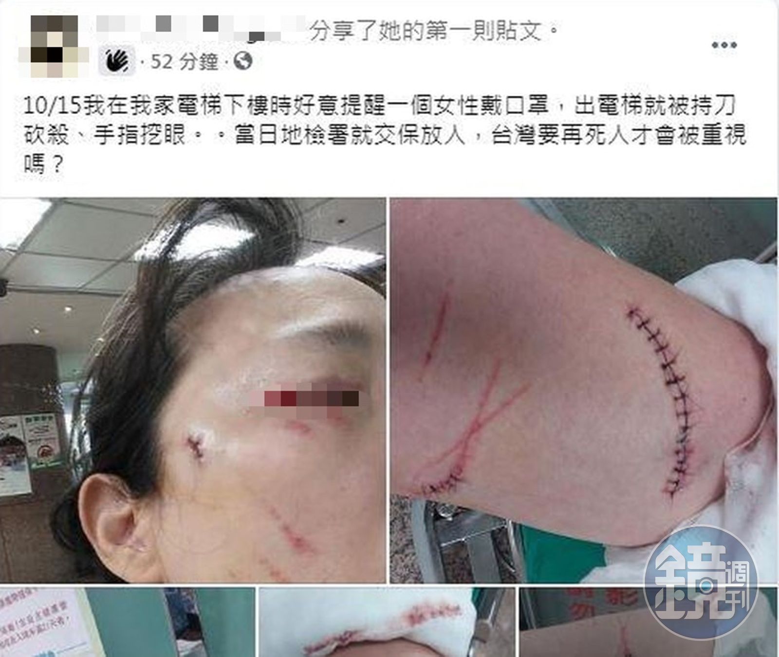 王女事後則上臉書社團「爆料公社」貼出受傷照片控訴,「10/15我在我家電梯下樓時好意提醒一個女性戴口罩,出電梯就被持刀砍殺、手指挖眼,當日地檢署就交保放人」,並稱「台灣要再死人才會被重視嗎?」。