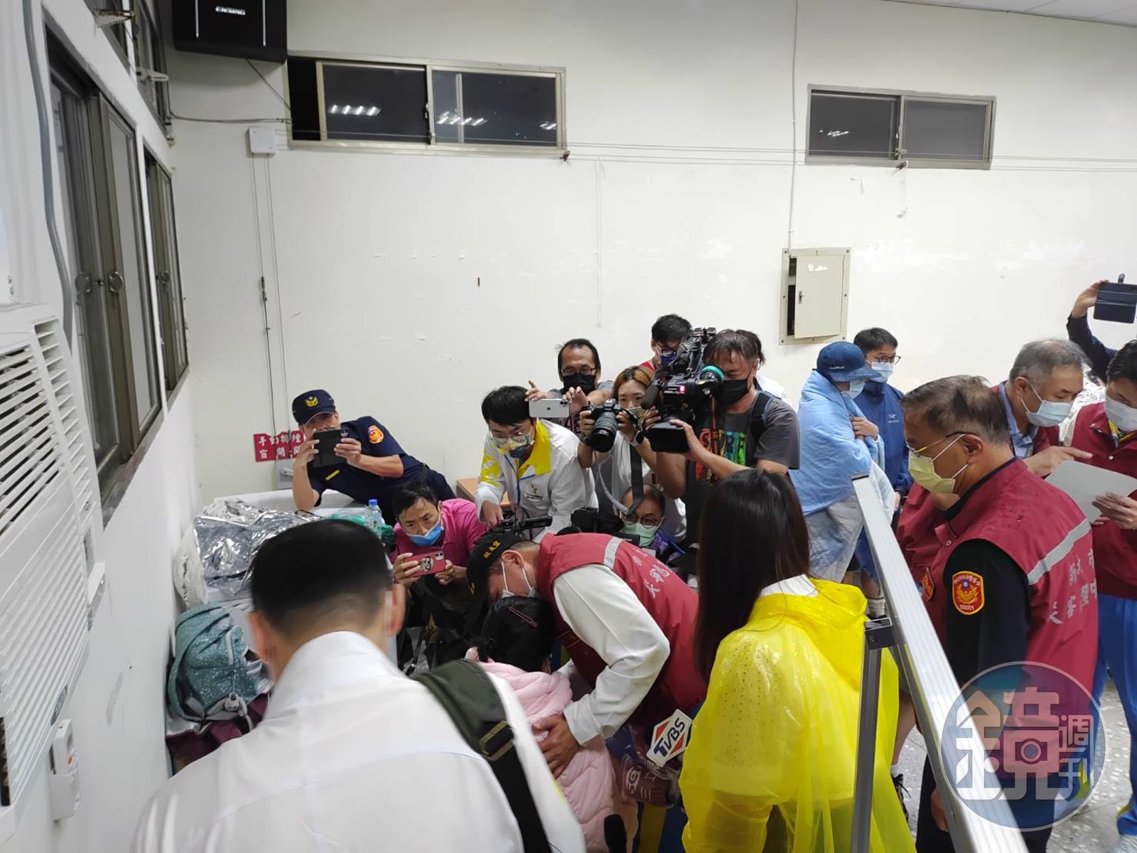 新北市雙溪區虎豹潭16日發生遊客被暴漲溪水沖走的意外,新北市長侯友宜(中、紅衣者)也前往指揮所慰問家屬。(翻攝畫面)