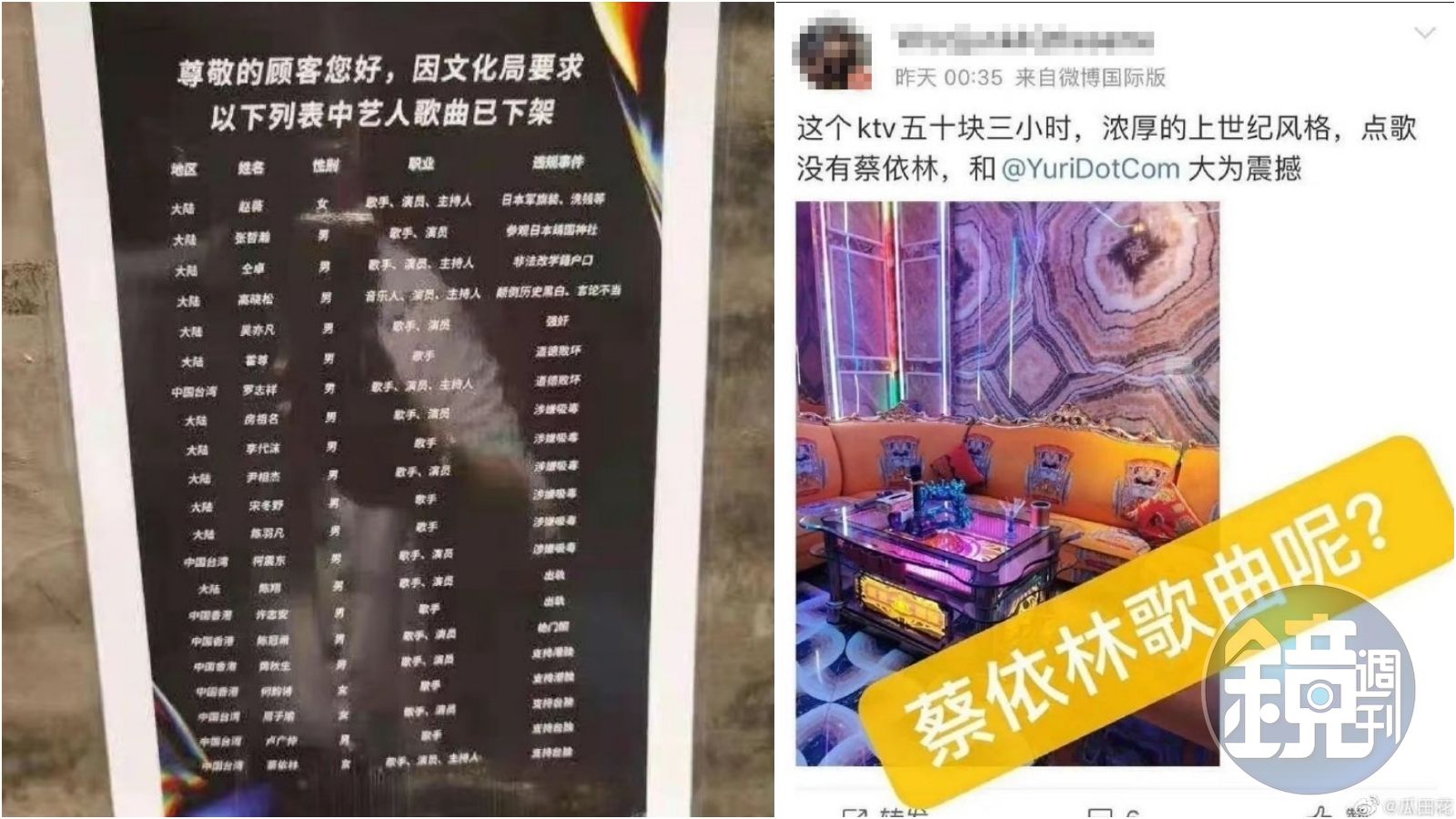 根據微博上的中國網友分享,有多家中國KTV公告,因應當局要求下架中港台多名藝人的歌曲,並列出了這些藝人的「違規事件」,例如中國大陸的趙薇「穿日本軍旗裝、涉嫌洗錢」;張哲瀚「參觀日本靖國神社」;吳亦凡「強姦」;霍尊、羅志祥「道德敗壞」;房祖名、李代沫、宋冬野、柯震東等「涉嫌吸毒」等等。
