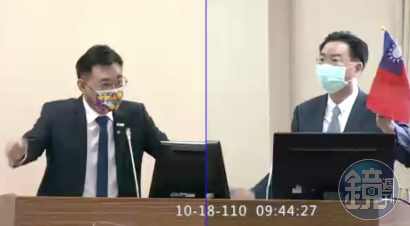 國民黨立委江啟臣質詢時上台就送吳釗燮國旗,要求他揮旗,並說「我看你也沒有吐血」。席間質疑吳釗燮交給立法院的報告沒有「中華民國」4個字,但吳釗燮表示「封面就寫中華民國」。然而因江啟臣提問用掉了所有質詢時間,吳釗燮問「時間結束了請問我現在可以回答嗎?」發言卻引起江啟臣憤怒拍桌,猛批「你就是不想回答嘛,現在都很大牌了可以反質詢嘛」。