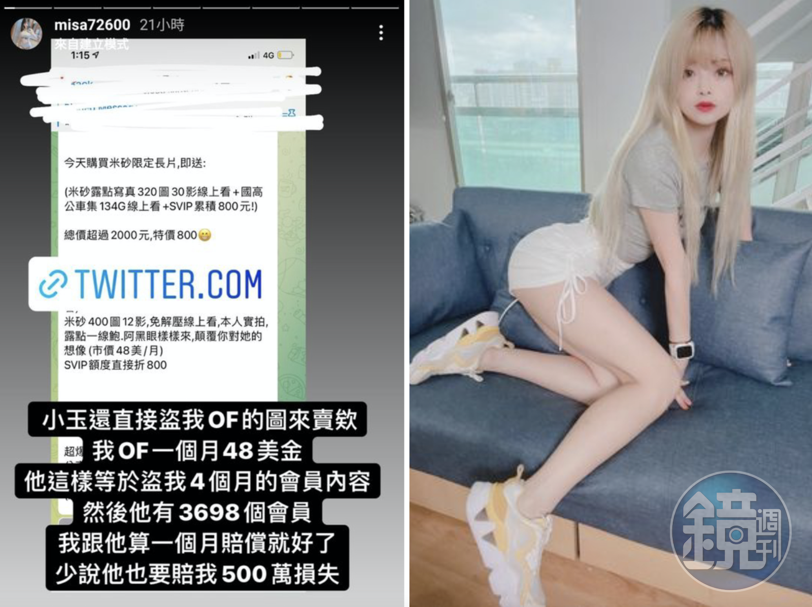 米砂估算,她每個月向會員收取48元美金(約台幣1350元),從小玉盜照的內容來看,起碼有四個月的內容被偷,米砂說:「他有3698個會員,我跟他算1個月賠償就好了,少說他也要賠我500萬損失!」並且鼓勵網友幫忙蒐證,甚至會給予獎賞。