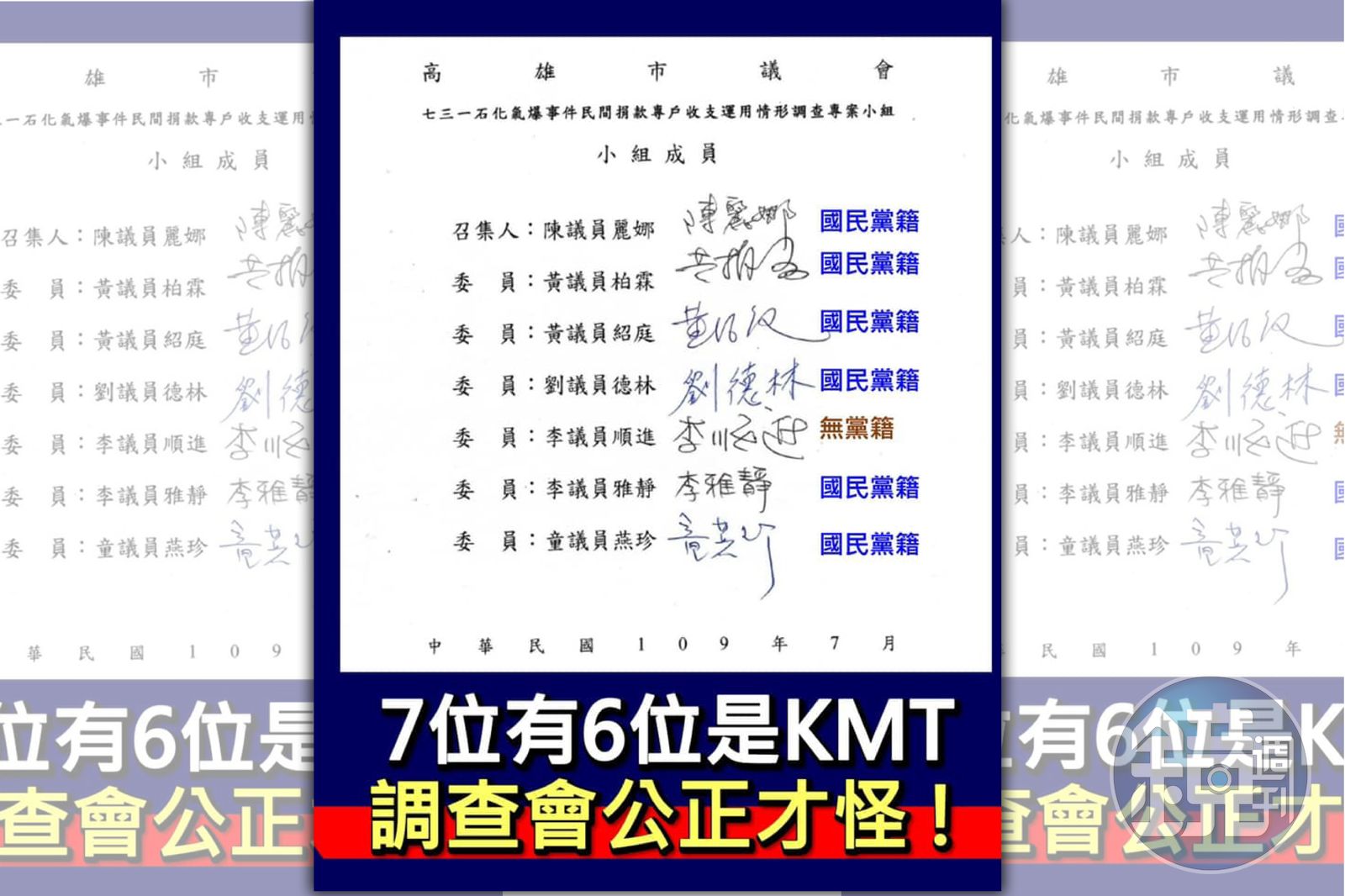 康裕成強調,前議長許崑源指派了國民黨籍的陳麗娜、黃柏霖、黃紹廷、劉德林、李雅靜、童燕珍六人,以及無黨籍的李順進,其中不乏深藍的鷹派議員,整個調查過程中,極盡抹黑、扭曲之能事,調查小組彷彿私設刑堂,對菊市府官員清算,最後更是建議前市長韓國瑜將此案移送檢調,結果,今年九月,專案小組遭地檢署打臉!檢察官以「查無犯罪事實簽結」,還菊市府官員一個清白、公道。