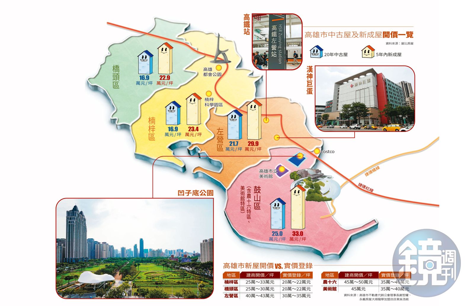 永義房屋高雄經管會會長鄭曜德也提出建議方案,如果民眾不堅持買在橋頭、楠梓區,可朝早期重劃區如三民、苓雅、前金等區,找屋齡約20年的大樓,「每坪有機會僅17萬、18萬元,公設比20%,另每月每坪管理費40元,也低於新成屋的70元。」