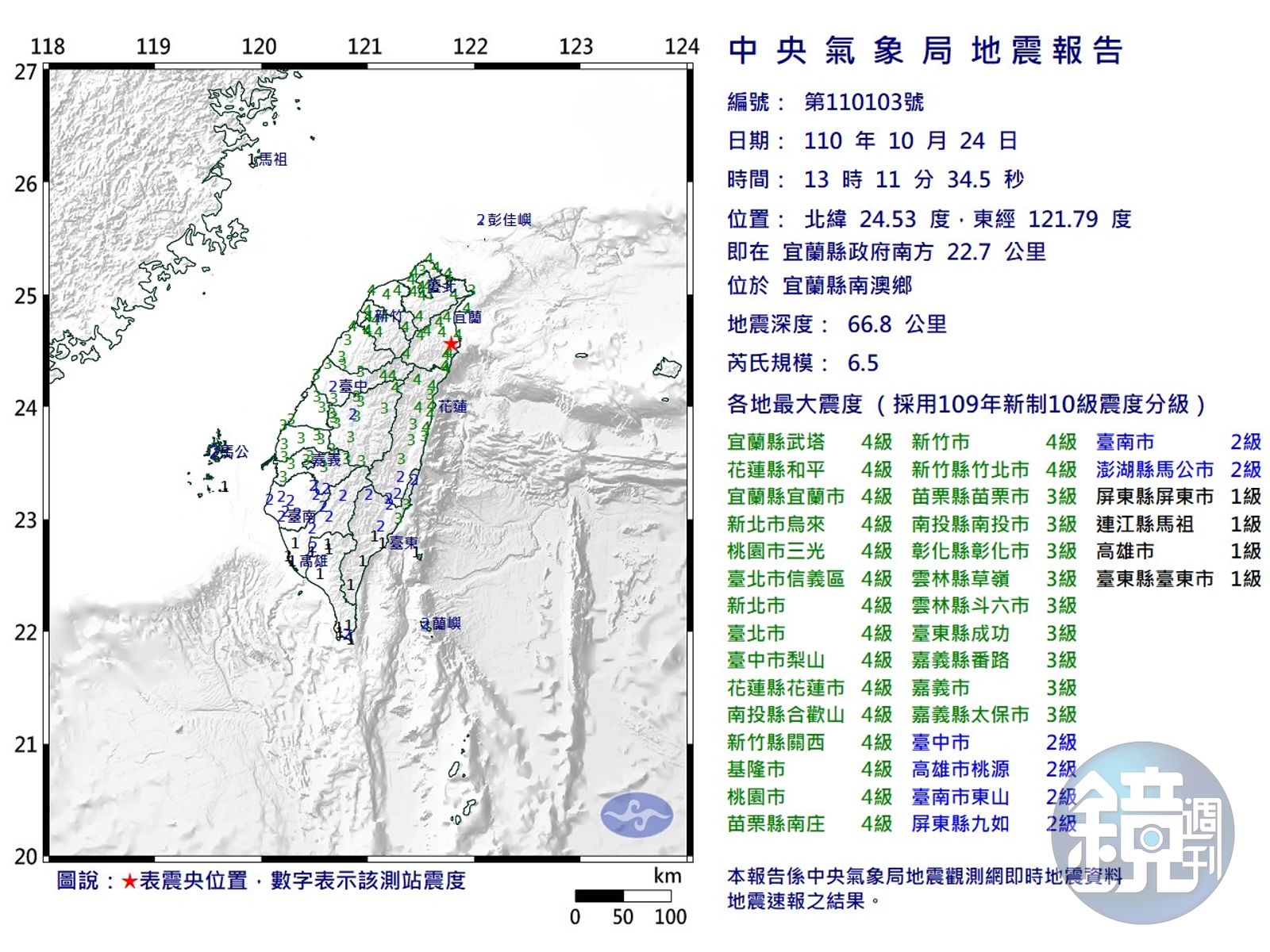 今日下午1時11分發生地震,全台幾乎都被強震襲擊,宜蘭縣、花蓮縣、新北市、桃園市、台北市、台中市、南投縣、新竹縣、基隆市、苗栗縣和新竹市最大震度達4級;彰化縣、雲林縣、台東縣、嘉義縣、嘉義市最大震度則達3級,另外高雄市、台南市、屏東縣、澎湖縣最大震度有2級,連江縣也有1級,幾乎全台有感。