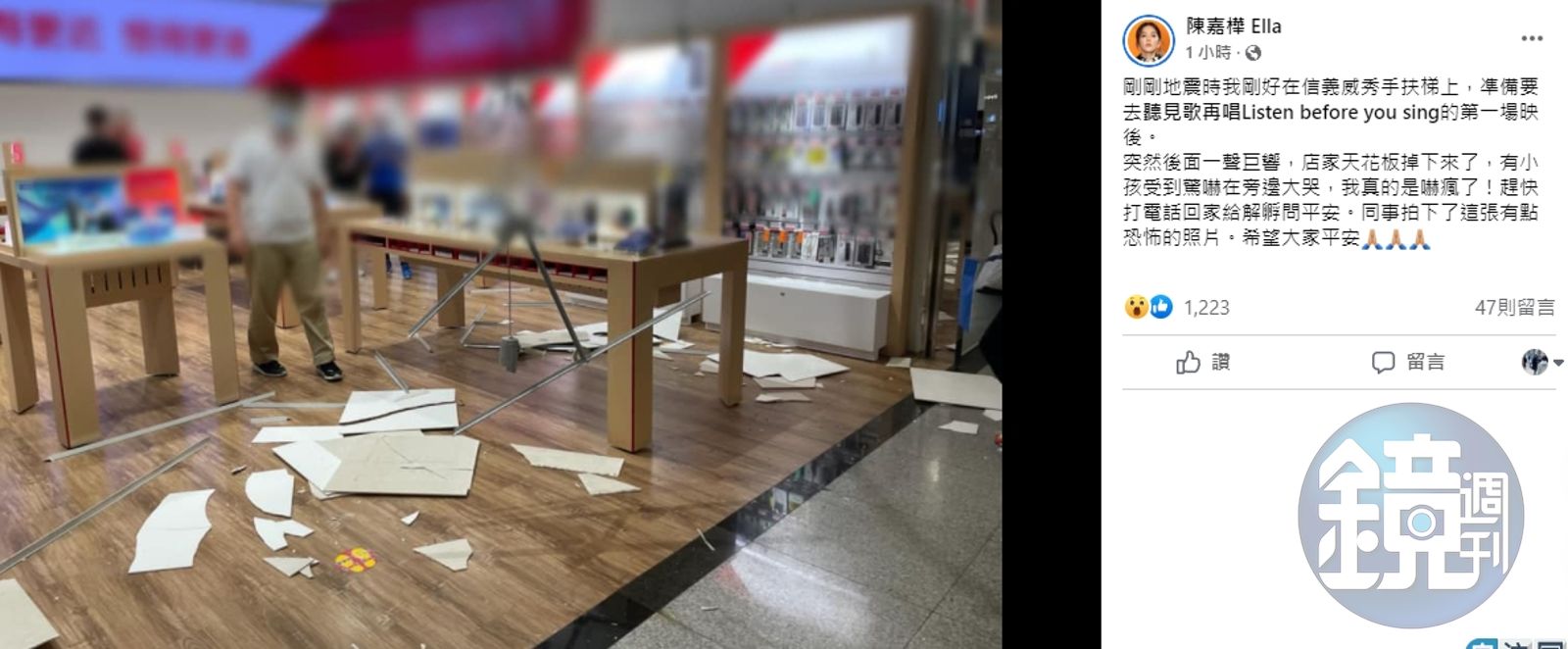 Ella第一時間先在臉書上發了「太震!嚇壞!大家快報平安!」,接著在留言處補充「剛剛地震時我剛好在信義威秀手扶梯上,凖備要去《聽見歌再唱》的第一場映後。突然後面一聲巨響,店家天花板掉下來了,有小孩受到驚嚇在旁邊大哭,我真的是嚇瘋了!趕快打電話回家給解孵問平安。同事拍下了這張有點恐怖的照片。希望大家平安。」並且po出店家一片狼藉的照片。