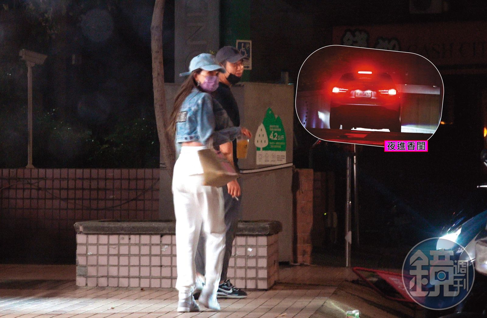 10月14日的晚上近11點,本刊在北市興安街的一間日本料理店外頭,捕捉到拐拐與友人的身影,同席的還有前「天氣女孩」成員趙靜儀(妞妞)。吃飽喝足後,拐拐跟戴著白色帽子的妞妞在餐廳門口擁抱、道別。