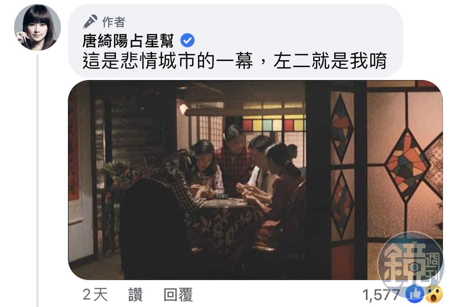 唐綺陽在臉書曝光關於自己的冷知識,她透露,自己曾經侯孝賢執導的電影《悲情城市》中,飾演酒女的角色,而這部電影的男主角,就是巨星梁朝偉。此外,她也曾和吳淡如演出過舞台劇《慾望街車》。