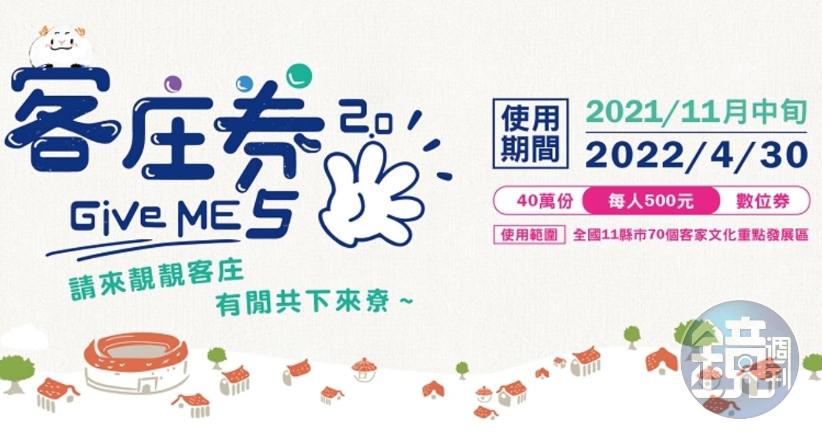 客委會推出的「客庄券2.0」為面額500元之加碼券,一共有40萬份,全為數位券,可於全國11個縣市共70個客家文化重點發展區的2,000多家合法登記店家使用,包括餐廳、民宿、社區零售店等,但不包含電商、百貨、量販店或全國連鎖商店。