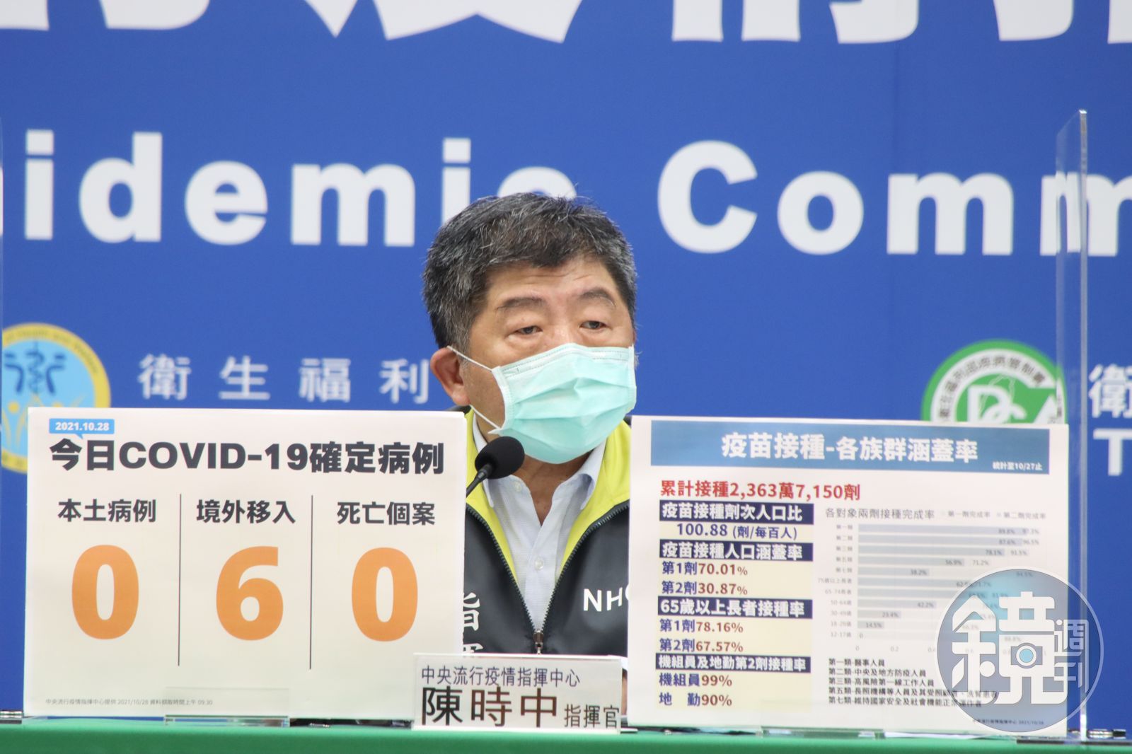 此外,陳時中也表示,台積電、鴻海永齡、慈濟三間企業和民間團體捐贈之第九批BNT疫苗90.21萬劑於10月28日上午抵台,對於此事再次表達感謝;該批疫苗效期至2022年3月1日,將由指揮中心統籌運用,儘速提供民眾接種。