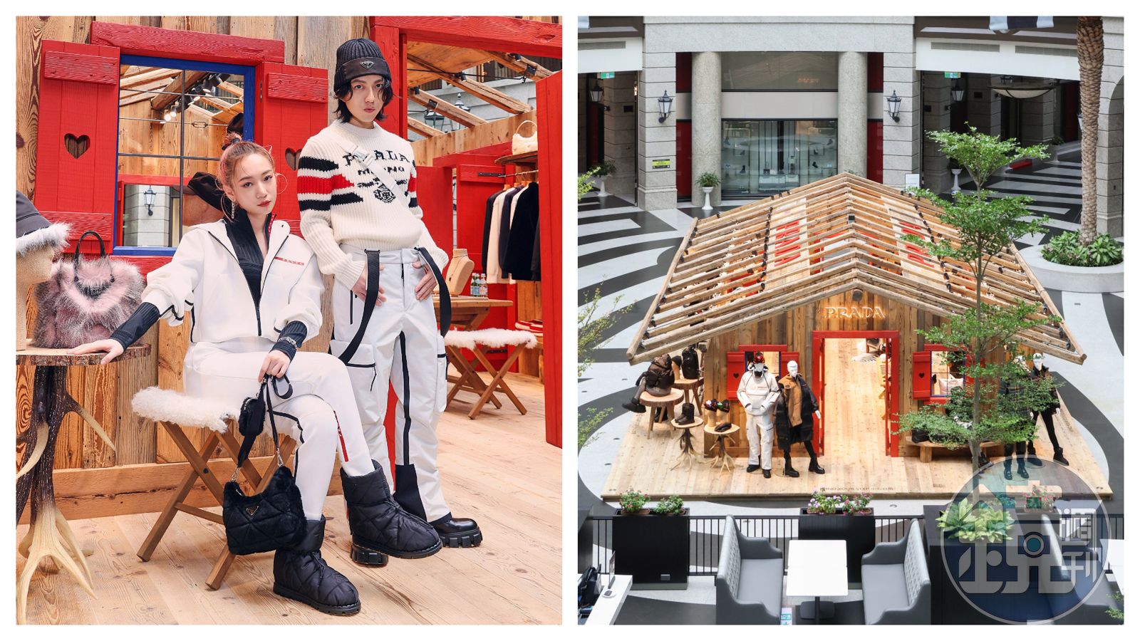 PRADA在BELLAVITA 1樓中庭打造了一座滑雪小屋,林宥嘉、吳卓源穿上最新的機能服裝一起逛街。(PRADA提供)發布時間:2021.10.28 06:15 臺北時間