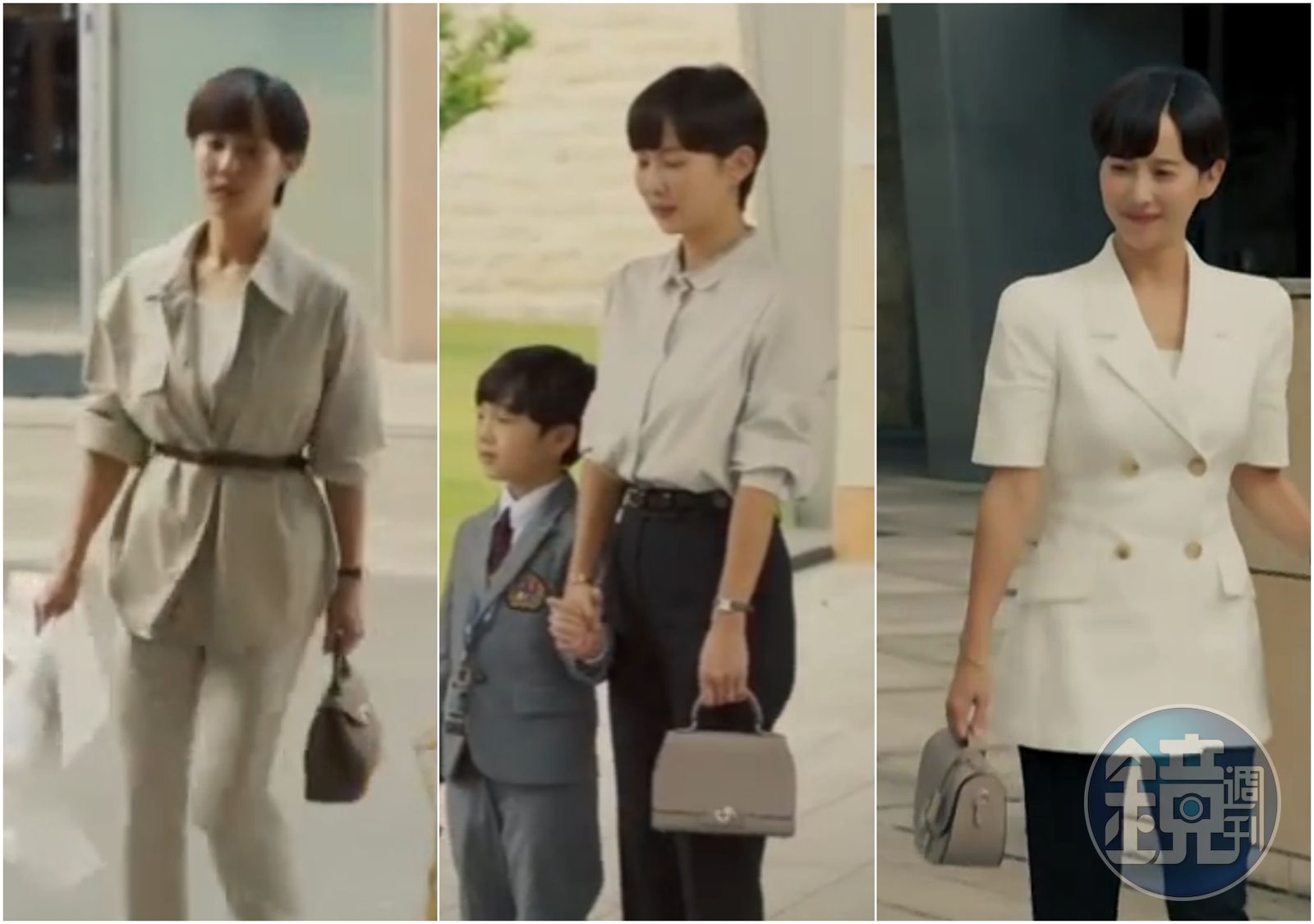 曹如晶手上的Flori斑鳩灰肩背包。NT130,900(MOYNAT提供)Flori火鳥粉肩背包。NT$130,900(MOYNAT提供)曹如晶逛市場時的Gaby大象灰金扣肩背包。NT123,000(MOYNAT提供)有別於學校裡貴婦媽媽們高調的穿著,曹如晶在戲中總是素雅俐落的造型,一場她死裡逃生獲救之後重返校園的劇碼,她身著白色套裝上衣,手上的Flori是對品牌1903年首只斜背包的全新演繹,以馬鞍包輪廓、Taurillon皮革令人回想旅途中的美好。
