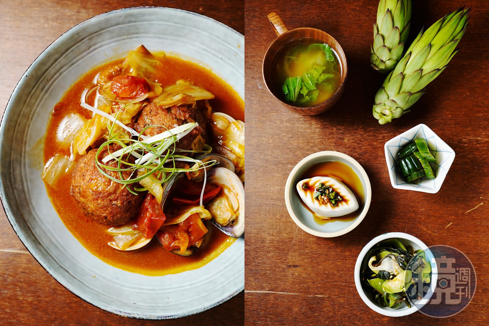 (左)「鮮味獅子頭」是美花家的年菜料理,加入了蛤蜊與蝦米,讓獅子頭多了海味的鮮甜。(280元/份);(右)每道定食都吃得到花生豆腐、湯品、小農野菜,以及用火龍果花做成的季節性漬物。發布時間:2021.11.03 13:57 臺北時間