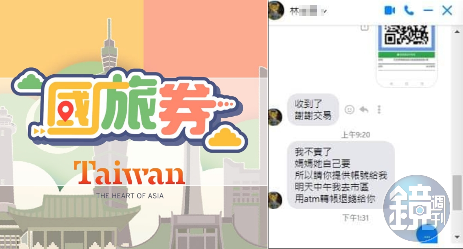 一名李姓女子在臉書上的五倍券相關社團中,看到有暱稱姓林的男子在轉賣價值1,000元的國旅券,便和對方約好交易。但在李女匯款完成,林男回覆收到款項後,沒過多久竟突然反悔表示「我不賣了,媽媽她自己要」,請李女提供銀行帳號,表示隔天會到市區用ATM轉帳退錢。
