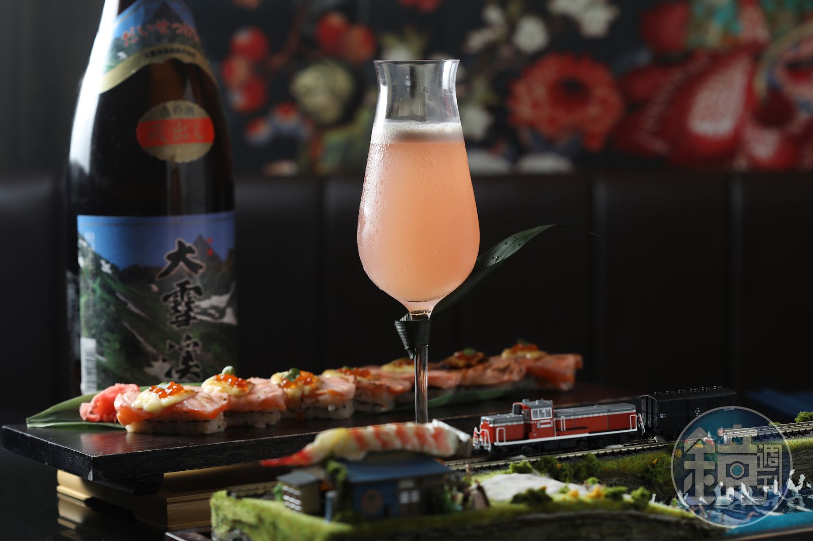 大車輪日料岩酒所調酒顧問李麒蒼以清酒與日式酒類為底,設計6款日系調酒。「一斤染」(前,280元/杯)以清酒、荔枝奶酒加入玫瑰糖漿與薑糖,搭配「焦糖鮭魚火車箱壽司」(後,單點箱壽司360元/份)特別合味。看似草莓可爾必思的「一斤染」隨著「焦糖鮭魚火車箱壽司」上桌,鮮嫩鮭魚握壽司上方點上特調美乃滋與糖粉後炙燒上色,形成一層如焦糖布丁的風味,Aroma選用乳白色的「SHIROI 荔枝奶酒」為底,奶香中有荔枝皮膜特有的酸澀,加上自製玫瑰糖漿與薑糖,帶有辛辣感的後韻讓這杯看似甜美的調酒更耐喝。