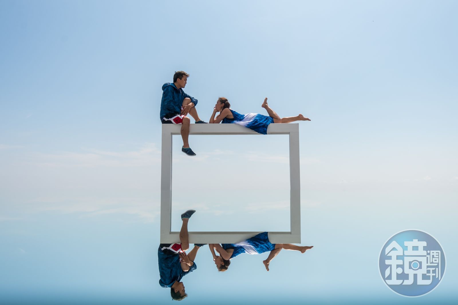 沙灘上錯落著白色階梯、ㄇ字型框架、堆疊的鵝卵石,太陽傘底下有個沙坑,上面有一台相機和鏡子,工作人員賣力的指示客人變換各種姿勢,快門喀喀喀按下,一張張天空之鏡美照出爐,而且美得你想拍手叫好!這怎想得出來呀?烈日下的海天一色,我們就和花蓮版天空之鏡互動出意想不到的構圖,當然你也可以自由發揮,工作人員完全配合。