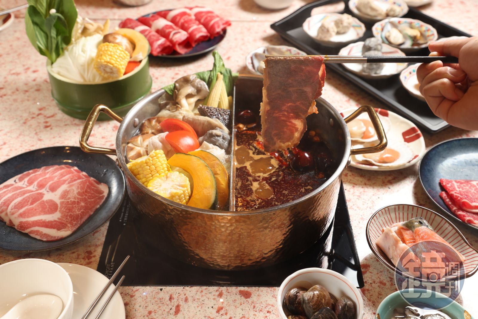 店內提供2種湯頭,一是汕頭湯底,用新鮮大骨和多種蔬菜,以及少許扁魚熬製,味道清甜爽口;另一種是麻辣湯底,以26種中藥材炒出香氣,喝起來有厚度,辣口不辣喉。主廚林哲正還用朝天椒、青花椒和大紅袍花椒提煉特製辣油,能讓辣度三級跳,滿足嗜辣老饕。