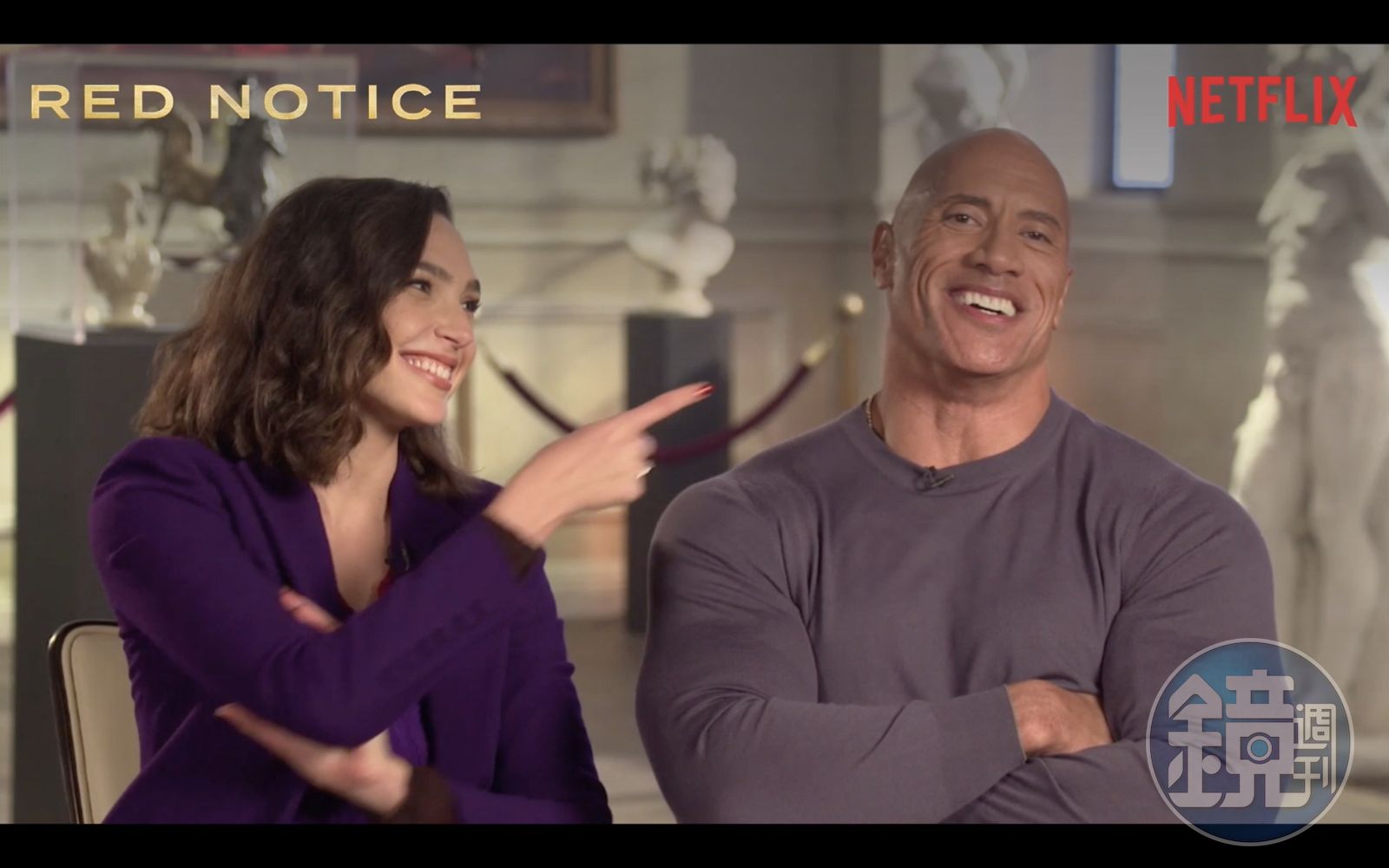 至於如果能從對方偷走一樣東西,蓋兒想偷走什麼?她想了很久,「我不知道可以從他身上偷什麼,頭髮嗎?」巨石強森被這樣一說,卻很大方地回應:「雖然這樣講很俗氣啦,如果我要偷,但我會偷走她的心,因為她有一個善良的心。」蓋兒一聽,也不甘示弱:「如果我可以偷走巨石強森任何一樣東西,我會偷走他的微笑。」
