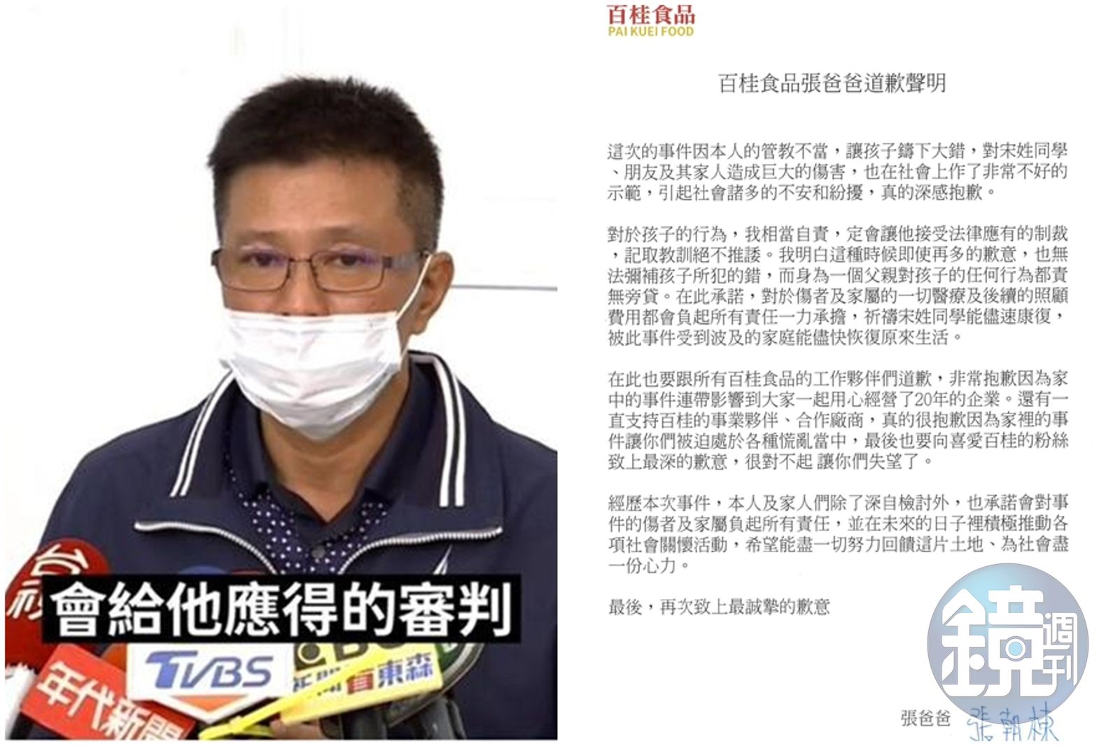 「百桂食品」官方臉書昨(10日)晚一度關閉,今日接近中午又重啟,張姓惡少父親張朝棟也刊登附有本人簽名道歉文。張朝棟表示,「這次的事件因本人管教不當,讓孩子鑄下大錯,對宋姓同學、朋友及其家人造成的巨大傷害,也在社會上做了非常不好的示範,引起社會諸多的不安與紛擾,真的深感抱歉」。