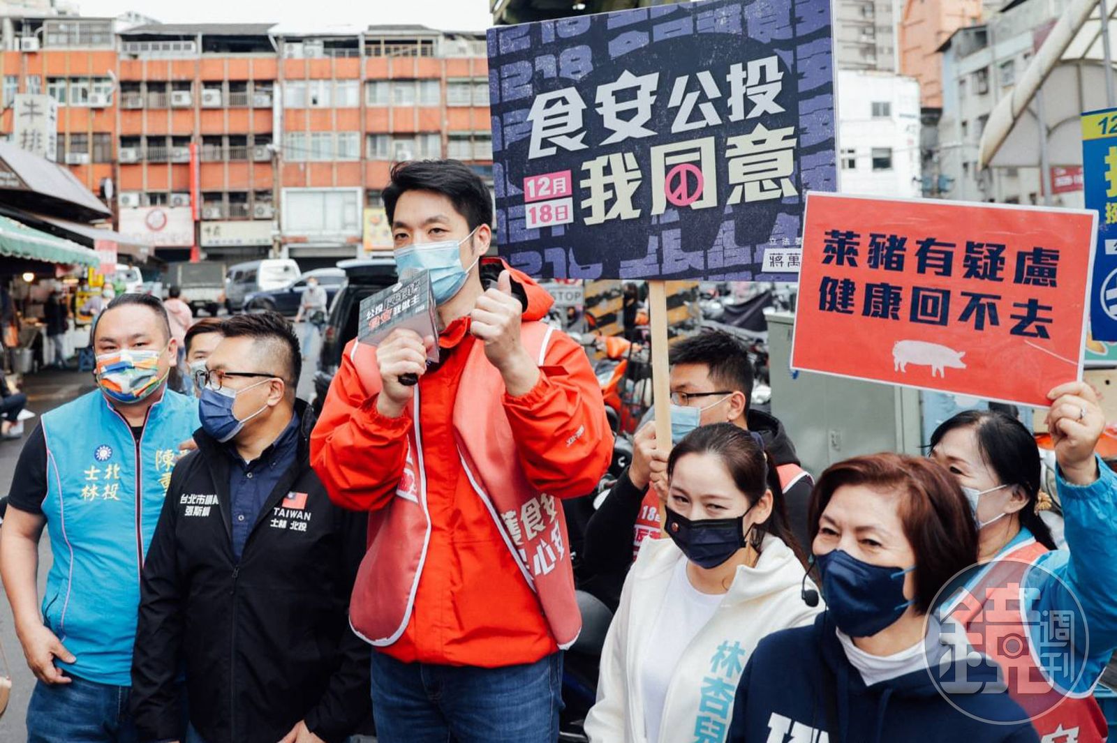 蔣萬安昨上午和國民黨青年團田方倫、滿志剛等人來到松山區的草埔市場,高喊捍衛食安、反對進口萊豬,呼籲民眾在下個月的公投票上要蓋同意。