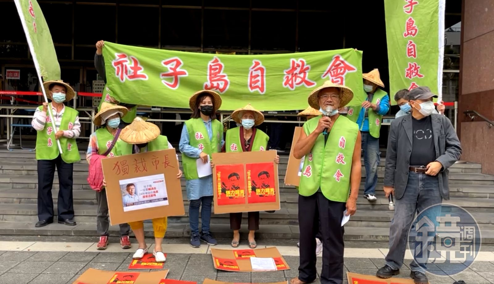 柯文哲上週二(9日)在市議會中,對社子島開發案揚言要「輾過去,不管了」,今自救會成員在綠色消費者基金會董事長、前台北市廉政透明委員方儉的陪同下,來到北檢門口抗議並按鈴提告。