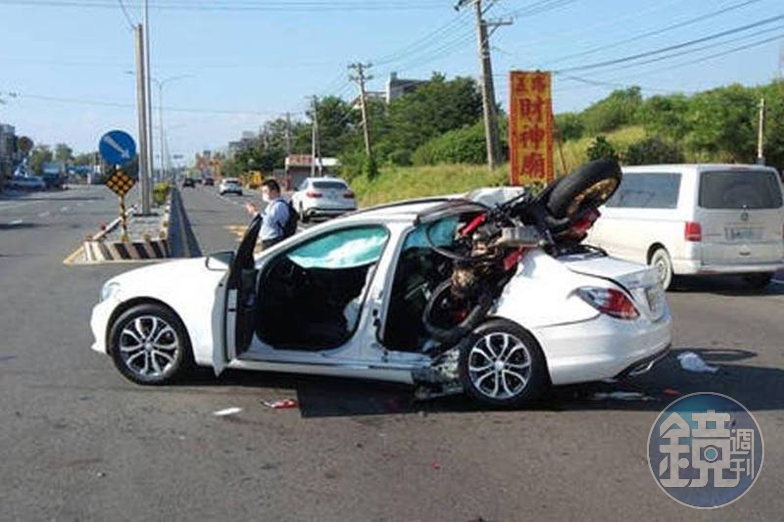 據監視器畫面顯示,重機騎士一路狂飆,恰巧1台白色賓士剛從停車場駛出,騎士疑似反應不及,當場撞上賓士,整台重機插進賓士車後座,騎士滿身重傷倒掛在賓士車上,緊急送醫後仍宣告不治。