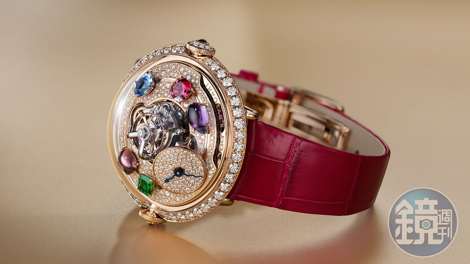 Flying T Allegra無論在名字還是外型,都很言簡意賅點名兩者的特色,Flying T是MB&F的飛行陀飛輪錶款,傾斜50度的偏心時分盤指示搭配飛行陀飛輪是它的精髓,後來在面盤材質上也用寶石做了幾款變化。而Allegra將切割形狀各異的彩色寶石,行星般不規則排列在面盤周圍,是寶格麗的招牌技法。如果對寶格麗早期作品有印象的話,會發現Allegra有2005年那款Astrale的基因在裡面,將橄欖石、電氣石、紅榴石以及黃玉等有色寶石,散佈成一個星空般的小宇宙,Fabrizio在形容這只聯名款的時候,說它從側面看上去的形狀就像飛碟一樣立體,說來也是滿貼切的。