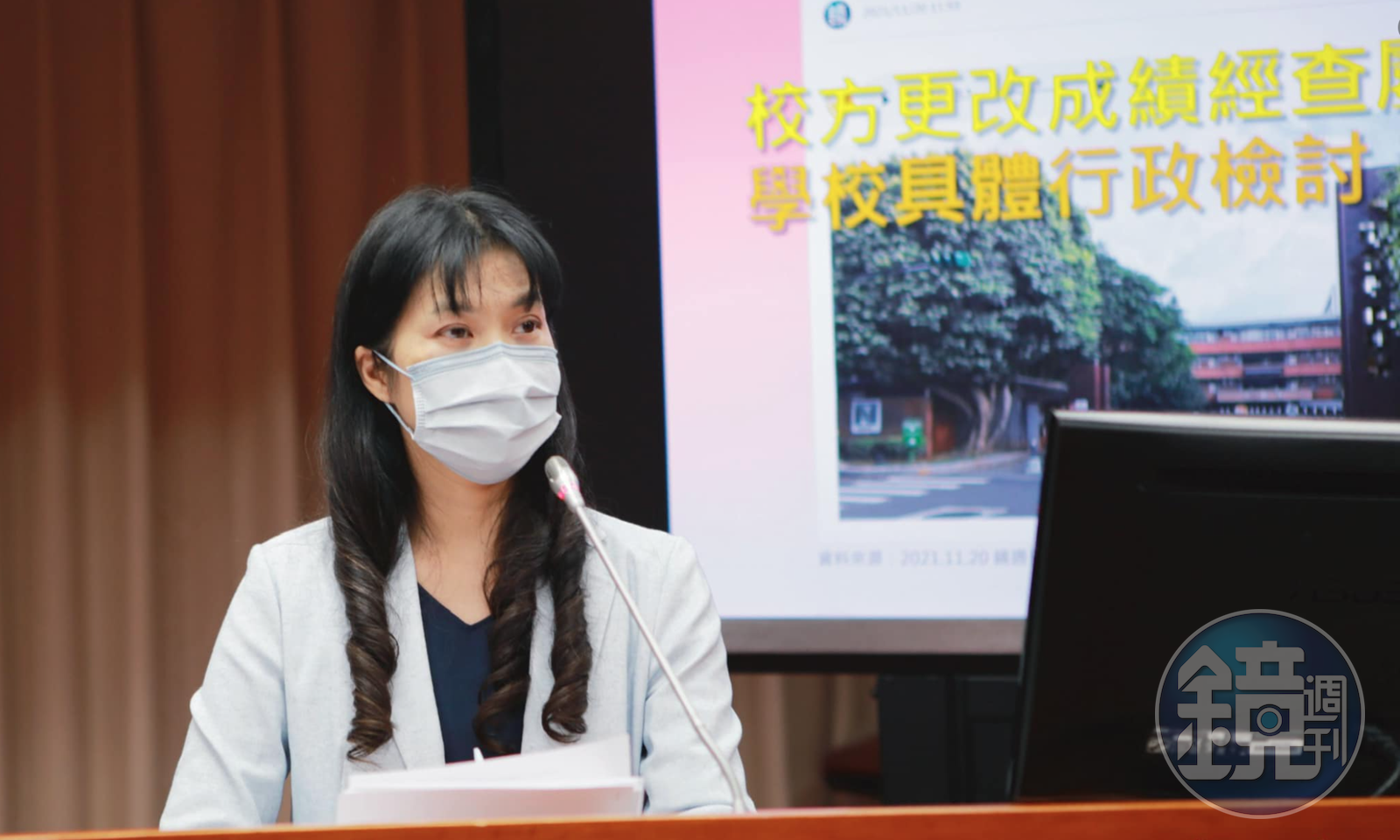 立委陳秀寶在教育委員會質詢時指出,教育部在去年8月回覆檢舉的老師稱:「該檢舉案經查證確有學生成績被更改,是由學校行政人員更正,授課老師並未主動申請」等情事,足見教育部認定學校確實違反規定,並祭出相關懲處。