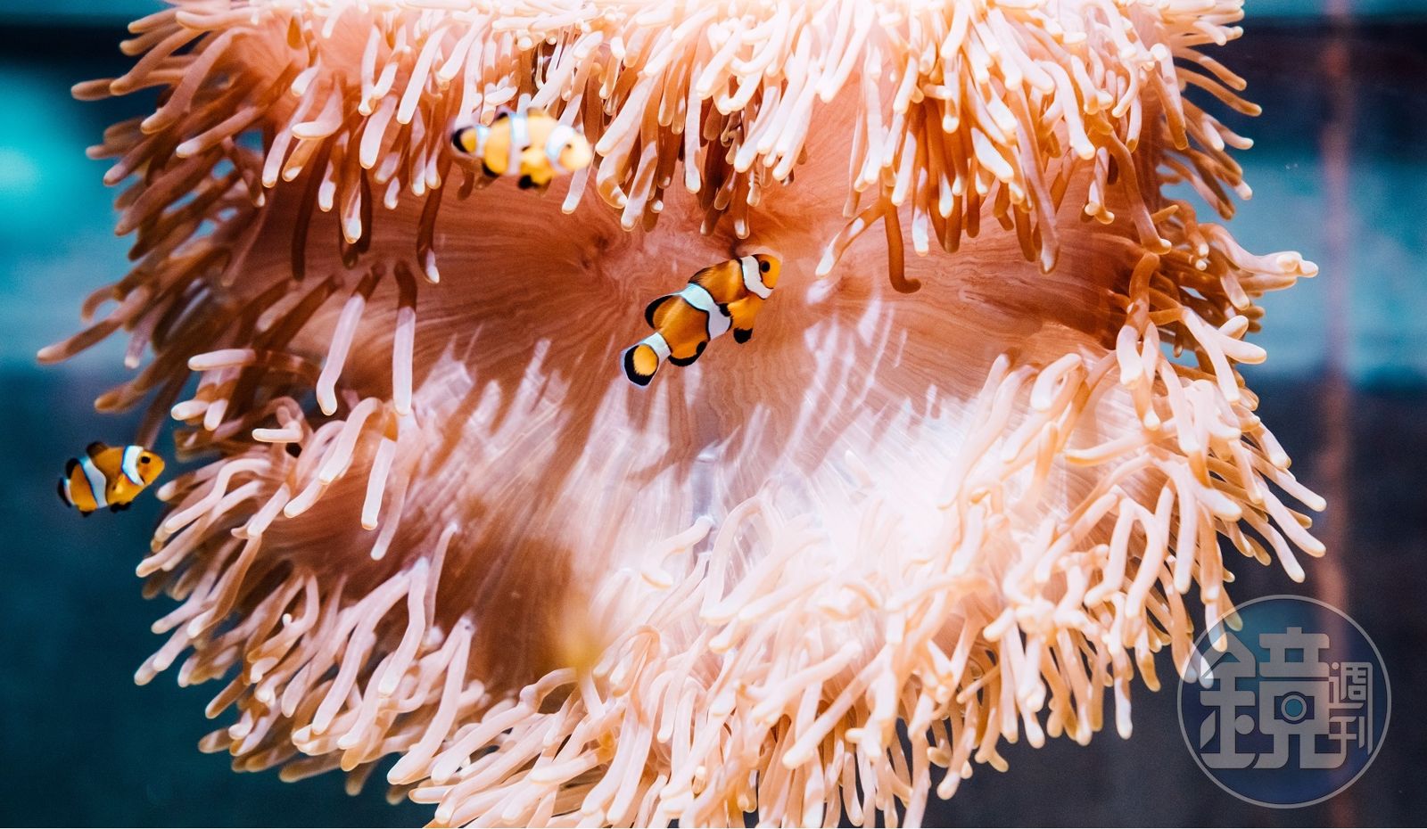 《璀璨之海:共生的海洋日常》共展出6種具有共生行為的海洋生物,包含與海葵共生的小丑魚、安波托蝦、海葵蟹、寄居蟹、拳擊蟹等。其中移動時常前後晃動腹部,穿梭於海葵間的安波托蝦,彷彿不斷扭屁股十分可愛,也讓牠們有「性感蝦」的稱號。