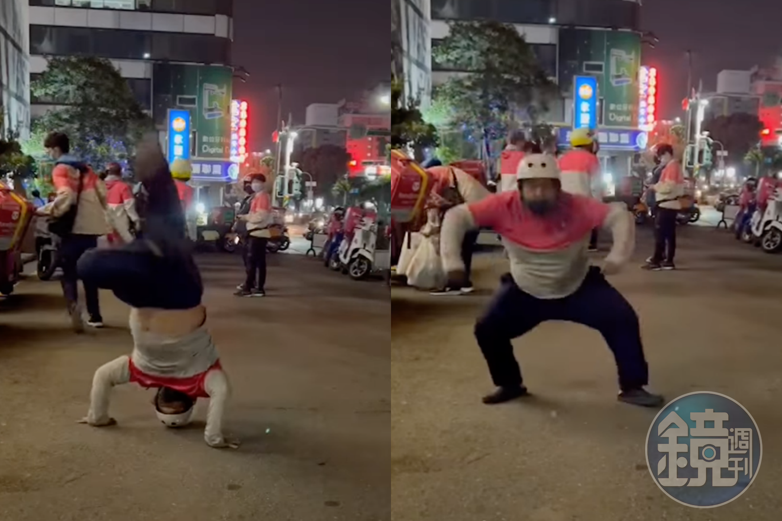 一名外送員在等單時於大街上大跳街舞,獲封「被熊貓耽誤的舞者」。(翻攝自「爆廢公社公開版」臉書)發布時間:2021.11.24 17:44 臺北時間