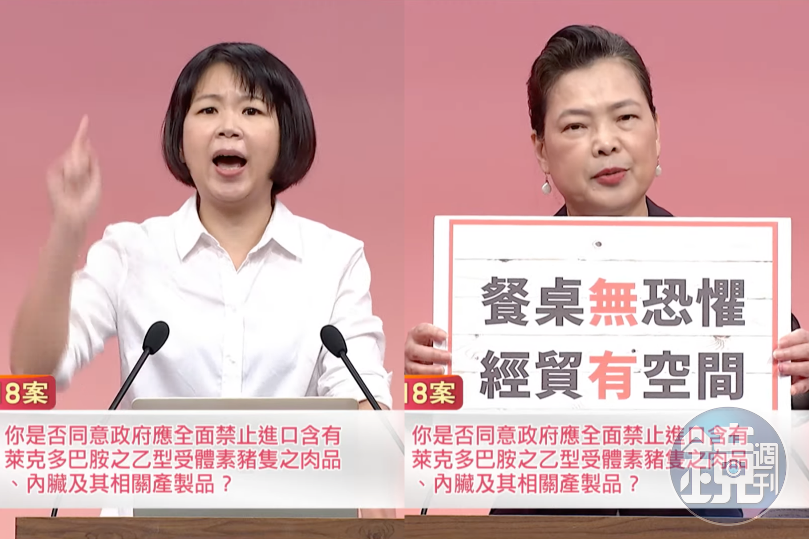 第一輪辯論開始,正方代表林麗蟬首先出戰,她表示,公投主文中沒有一個字提到美國,但是執政黨卻把禁萊豬變成禁「美」豬,把一個單純的食安問題,扭曲成複雜的兩岸問題。林麗蟬稱,只要你和你的孩子未來在餐桌上不想吃到含有萊克多巴胺的豬肉,12月18日就要出來投同意票。