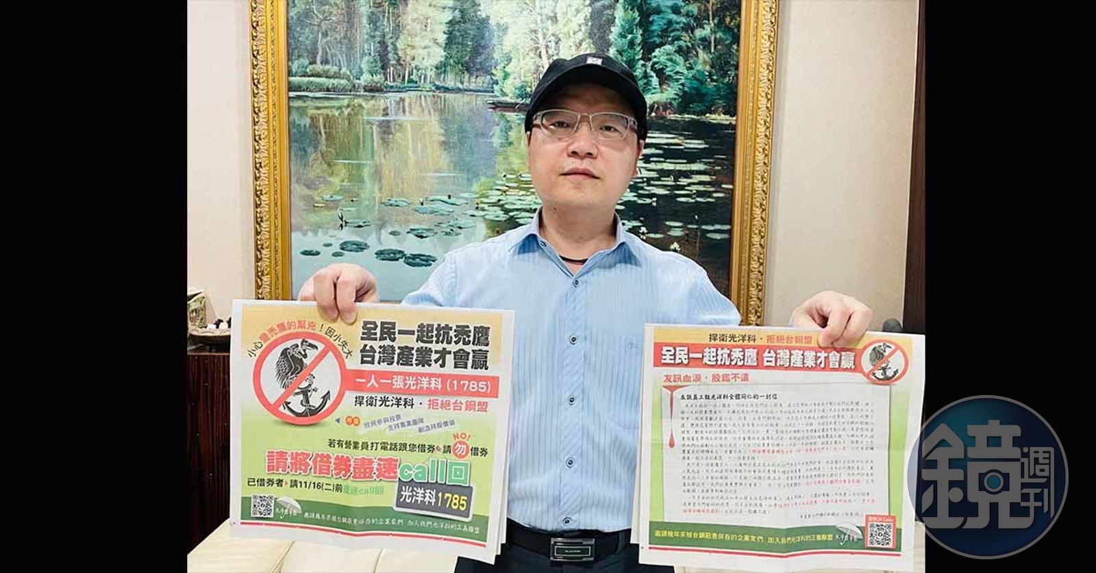 眼神堅定,說話溫和但有力,他是光洋撐傘團團長莊世雄,在光洋科已任職12年,目前擔任業務部門的中階主管,他表示撐傘團是一個支持公司派(專業經營團隊)的團體,目前人數超過650人,都是由公司員工及股東自動自發所組成的,且陸續增加當中。
