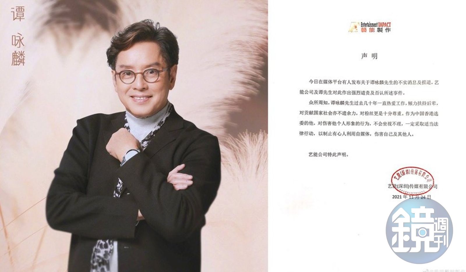 譚詠麟經紀公司「香港藝能製作」昨晚也緊急發聲明滅火。(擷自微博@香港藝能製作)發布時間:2021.11.25 15:10 臺北時間