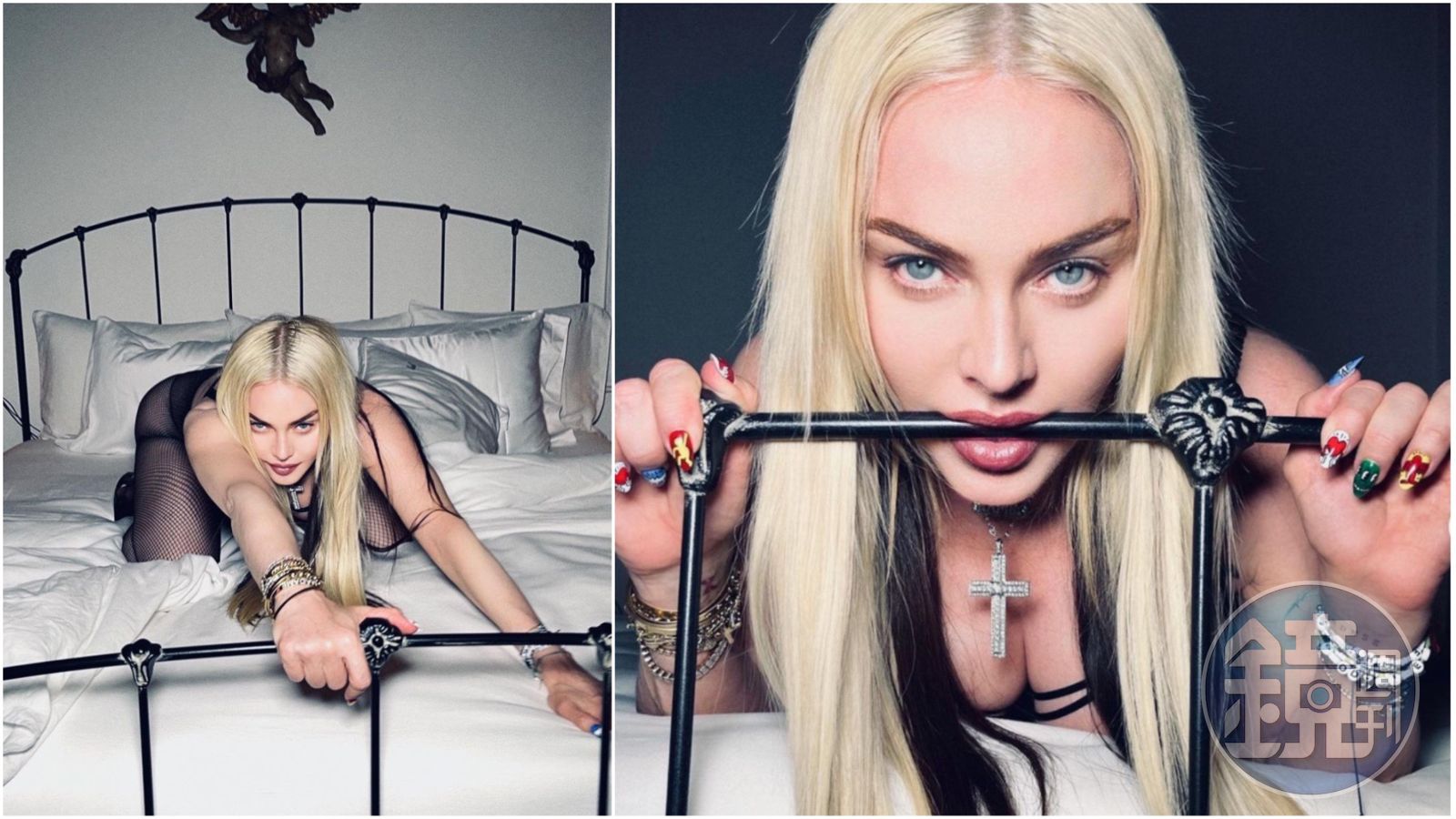 瑪丹娜63歲作風依然前衛大膽,近日她在Instagram曬一系列性感床照,身上穿著馬甲和網襪,踩著黑色高跟鞋,數張照片甚至直接露點,吸引全球粉絲朝聖。但因露點,照片隨即遭下架。