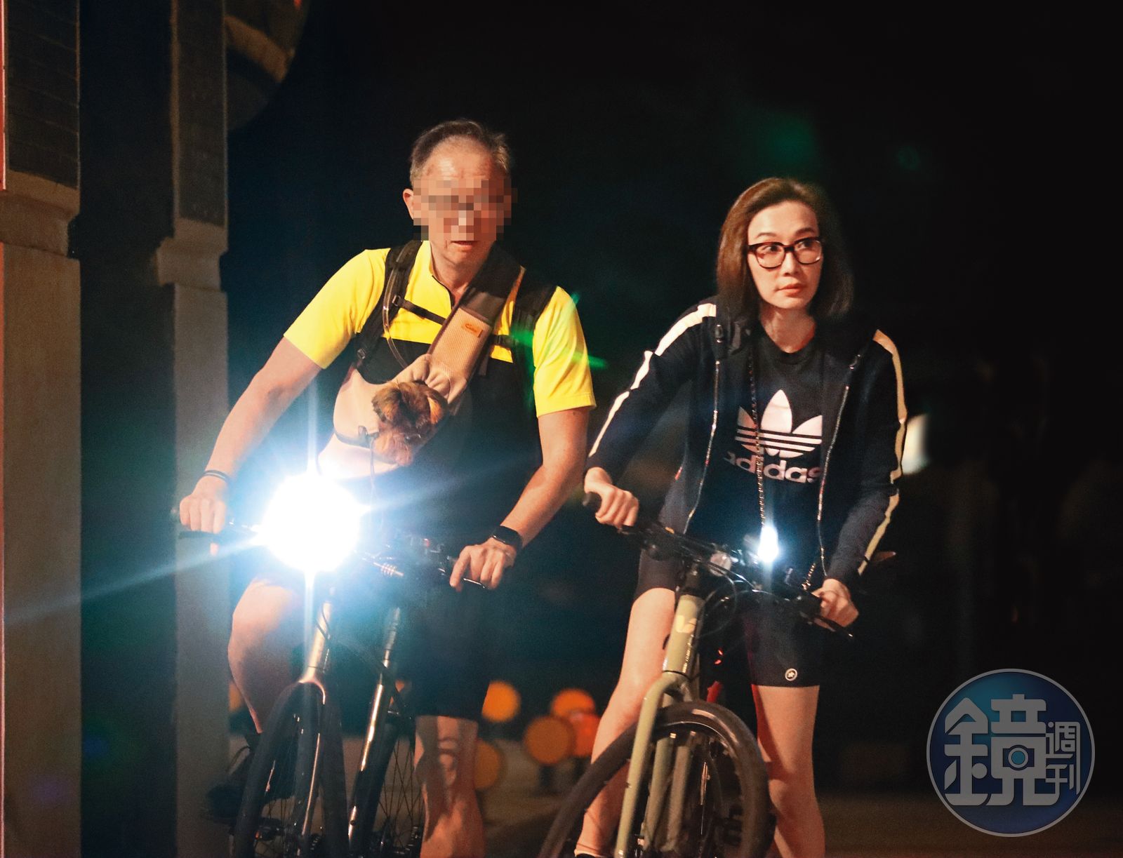 11月6日,23:13,錢德月上了崔姓富商新歡的車,準備到他家約會。只是到了隔天凌晨12點半左右,錢德月和崔姓富商帶著狗,竟然一同從車道騎腳踏車出來,興趣感覺非常樂活,而且騎到半路還停在路邊,富商就這麼接地氣地背著狗、喬好位子,隨後兩人騎往大直水門,朝向彩虹河濱公園的方位沿途騎行。