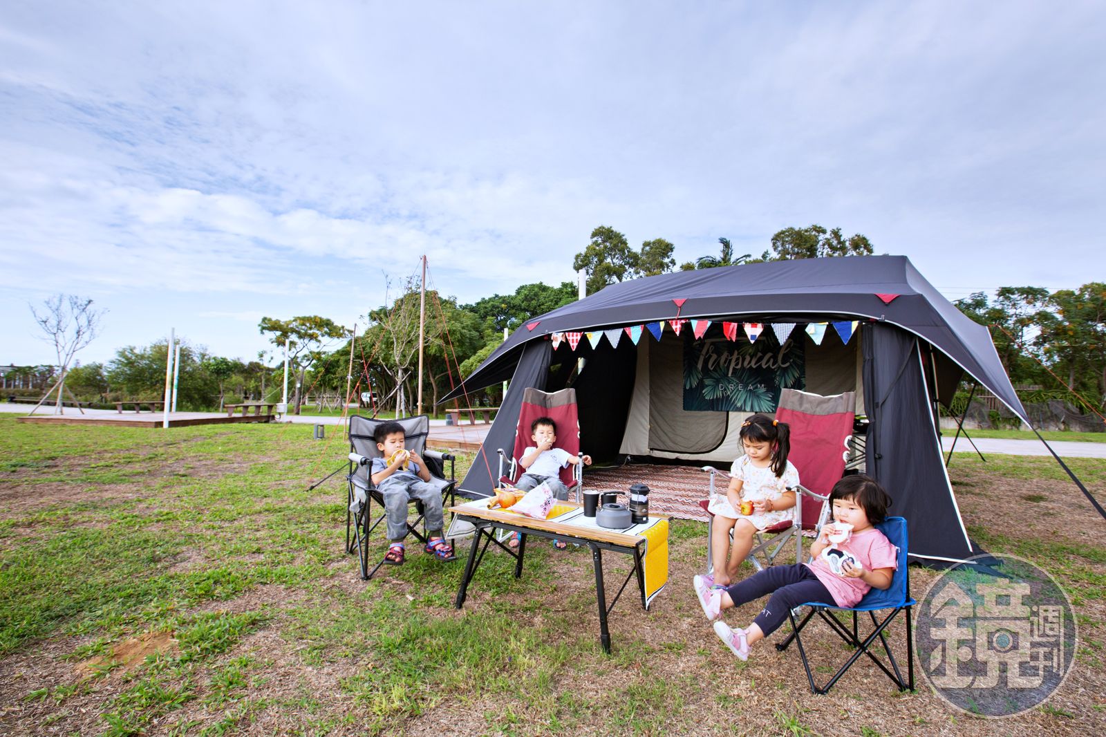 為了吸引市民朋友進到園區,園區2020年起導入露營活動,市民朋友預約成功後,只需繳付保證金、自帶帳蓬等器材,便可在劃設的營地免費紮營。園區作為環教場域,黃世昌表示,「這裡的營地強調低碳、無痕、永續,推薦營友們自帶輕食,更能愜意地享受綠色生活時光。」定時巡邏的保全機制增加安全性,營區的盥洗設施也相當整潔、完善,只需備好行囊、拋下手機和平板,就能暫別繁忙的都市生活,盡情在寬敞的草地上跑跳。