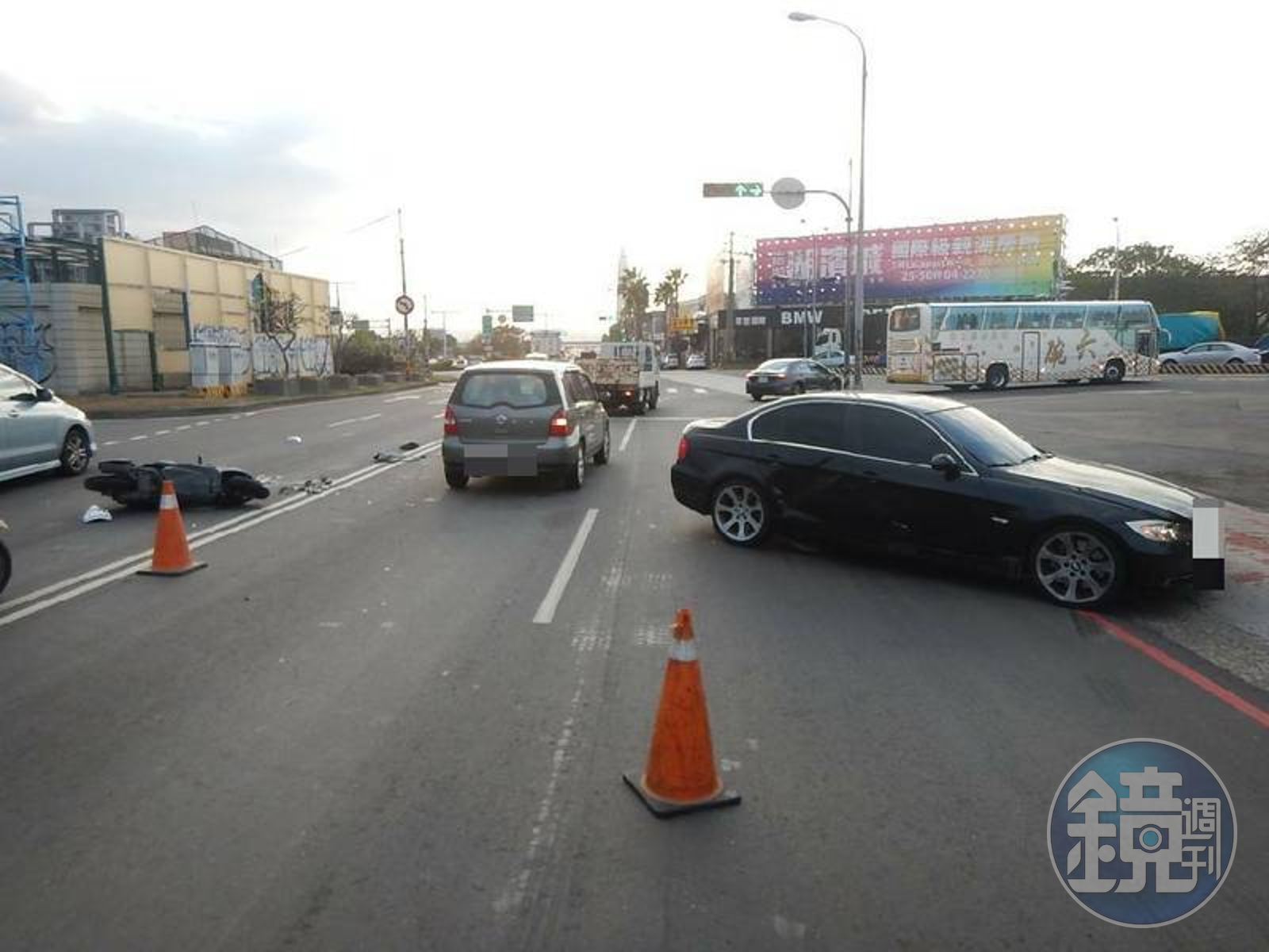 而六分局交通分隊調閱路口監視器,發現當時姜女駕駛黑色BMW轎車從環中路往北,在果菜市場前方迴轉道迴轉至環中路南下車道,但她在轉向後,突然跨越雙白線,其變換車道速度之快、幅度之大,猶如「螃蟹走路」,就在這時,撞上韓員的機車。