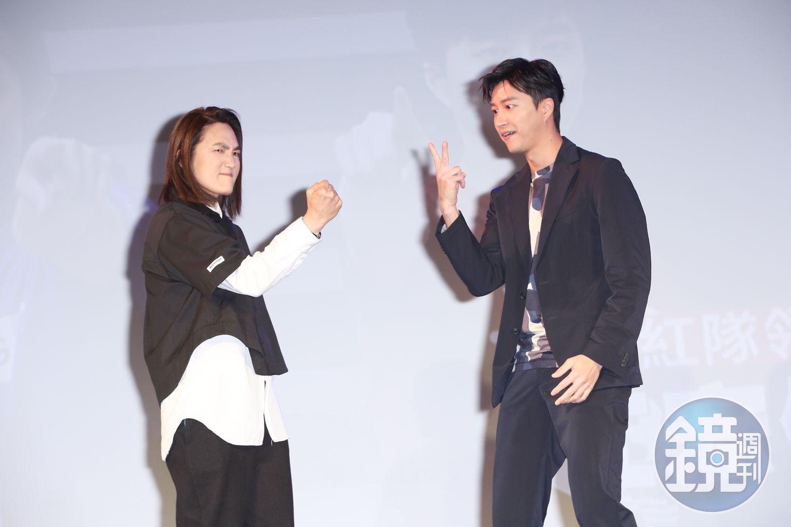 擔任紅、藍兩隊隊長的江宏傑(右)、錢薇娟(左),現身《全明星運動會》第三季首播記者會。發布時間:2021.12.04 12:10 臺北時間