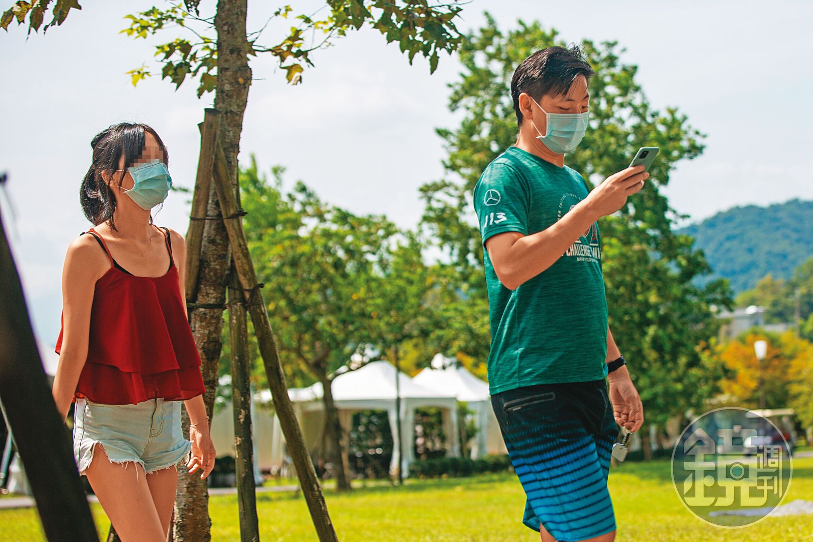2021年9月15日10 : 07,傅若軒(左)與吳姓千金(右)毫不避諱2人的婚外情的關係,高調放閃。此外,今年9月15日,本刊還在每晚要價上萬元的宜蘭礁溪老爺酒店露營車區,直擊傅、吳從同一台露營車下來,再一起與友人會合,一夥人到周邊的大草坪玩球、散步,2人在友人面前也不避諱地打情罵俏、嬉鬧。