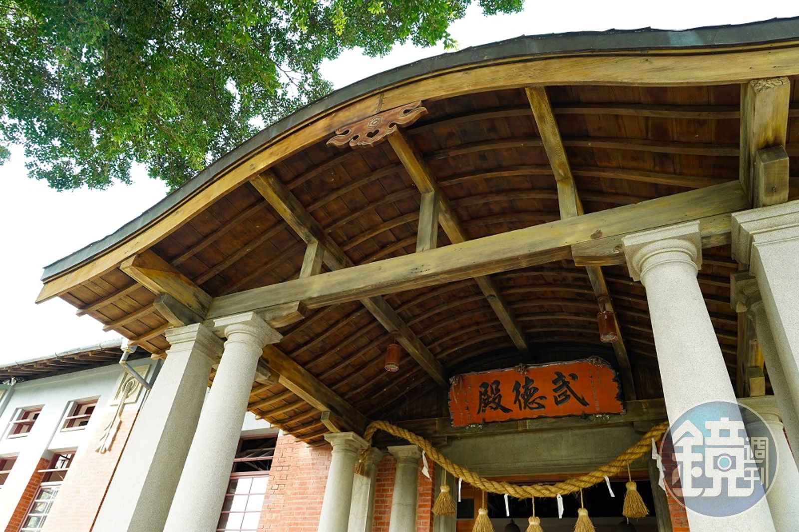 另外一棟,1924年完工的「高雄武德殿」,正值日治時期哈瑪星發展成熟期,正面為一般寺廟常見的「唐破風」型態,入口上方綁著注連繩,有辟邪納福之意,屋內中央設置神龕,以前左側東邊是劍道區,右側西邊是柔道區。隸屬台灣總督府的高雄州廳警務部「武德會支部」,為台灣少數僅存武德殿中創建最早的州廳級武德殿,目前還有劍道社團在此練習,繼續延續昔日武藝精神。