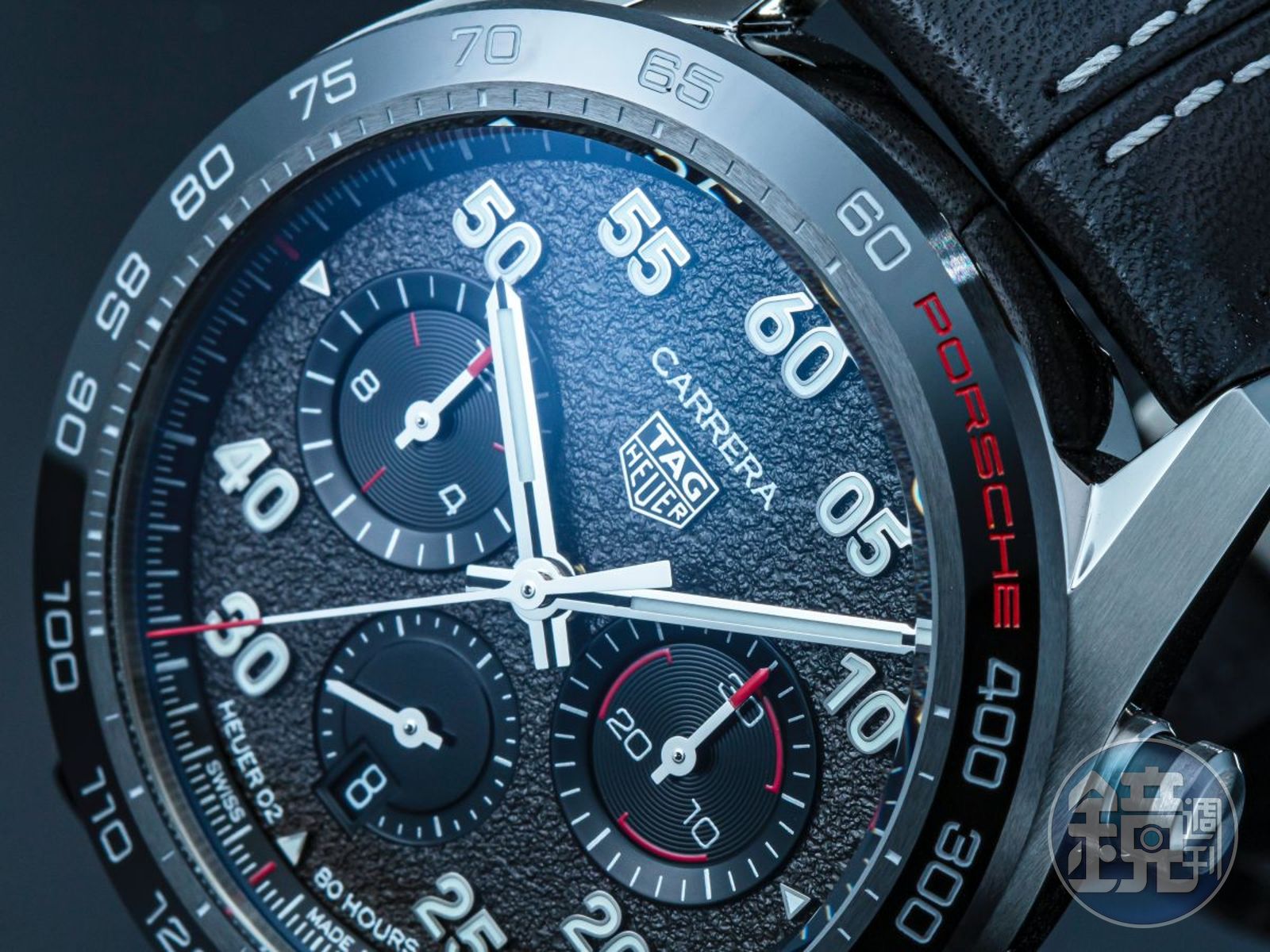 這款手錶有著非常帥氣的外型,以泰格豪雅Carrera運動計時腕錶設計為藍本,陶瓷錶圈上除了原本的測速尺,再刻上紅色的PORSCHE品牌字樣,最足以叫車迷熱血沸騰。 同時,保時捷經典的紅色、黑色及灰色貫穿整個錶款設計;而且自動盤以保時捷著名且獨有的方向盤為靈感,重新設計,透過錶背透明的藍寶石底蓋可以看到其中細節;另外,錶背也有「Porsche」和「TAG Heuer」的字樣。專為此款腕錶打造的灰色瀝青效果面盤,也完美傳達了對公路賽道的熱情;阿拉伯數字時標,則呼應保時捷跑車儀表板上的數字。