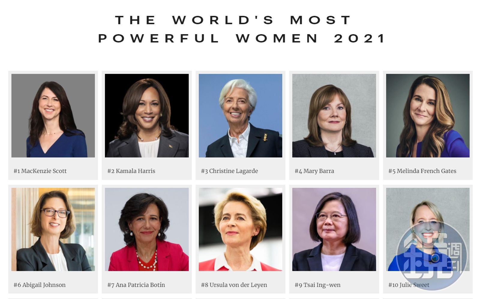 另外,長年占據榜單龍頭的梅克爾,在昨天確認交棒給新任德國總理蕭茲(Olaf Scholz)後跌出榜單外,也讓女性權威排名洗牌。至於2021年榜單前10名剩餘依序為,第4名美國通用汽車行政總裁芭拉(Mary Barra)、第5名微軟創辦人比爾蓋茲前妻梅琳達(Melinda Gates)、第6名美國富達投資總裁兼執行長詹森(Abigail Johnson)、第7名西班牙桑坦德銀行執行主席柏廷(Ana Patricia Botín)、第8名歐盟執委會主席范德賴恩(ursula von der leyen)、第10名跨國信息技術公司埃森哲首席執行官史威特(Julie Sweet)。
